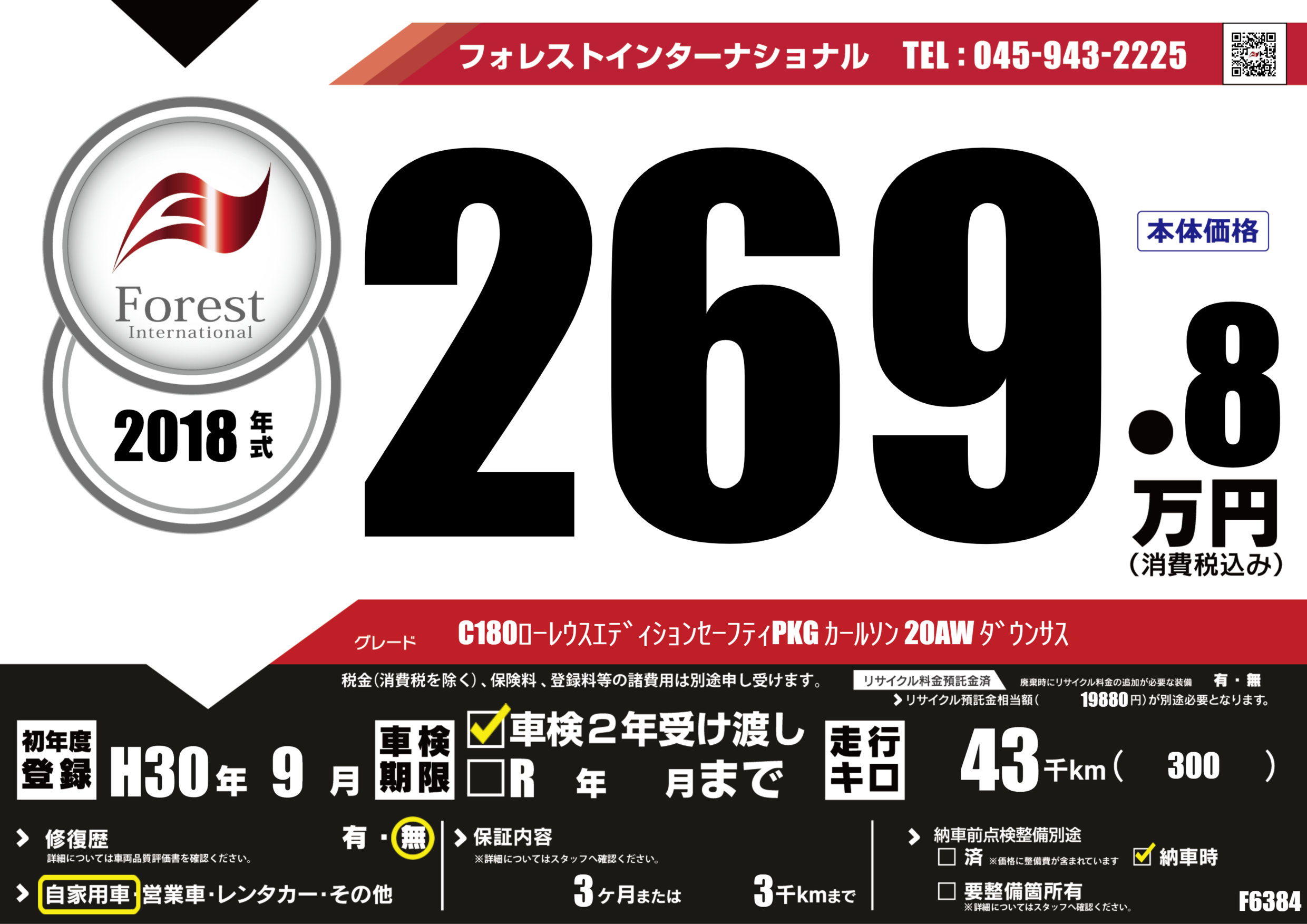 | 走行キロ | 4.3万km | 初年度登録 | H30年9月 |