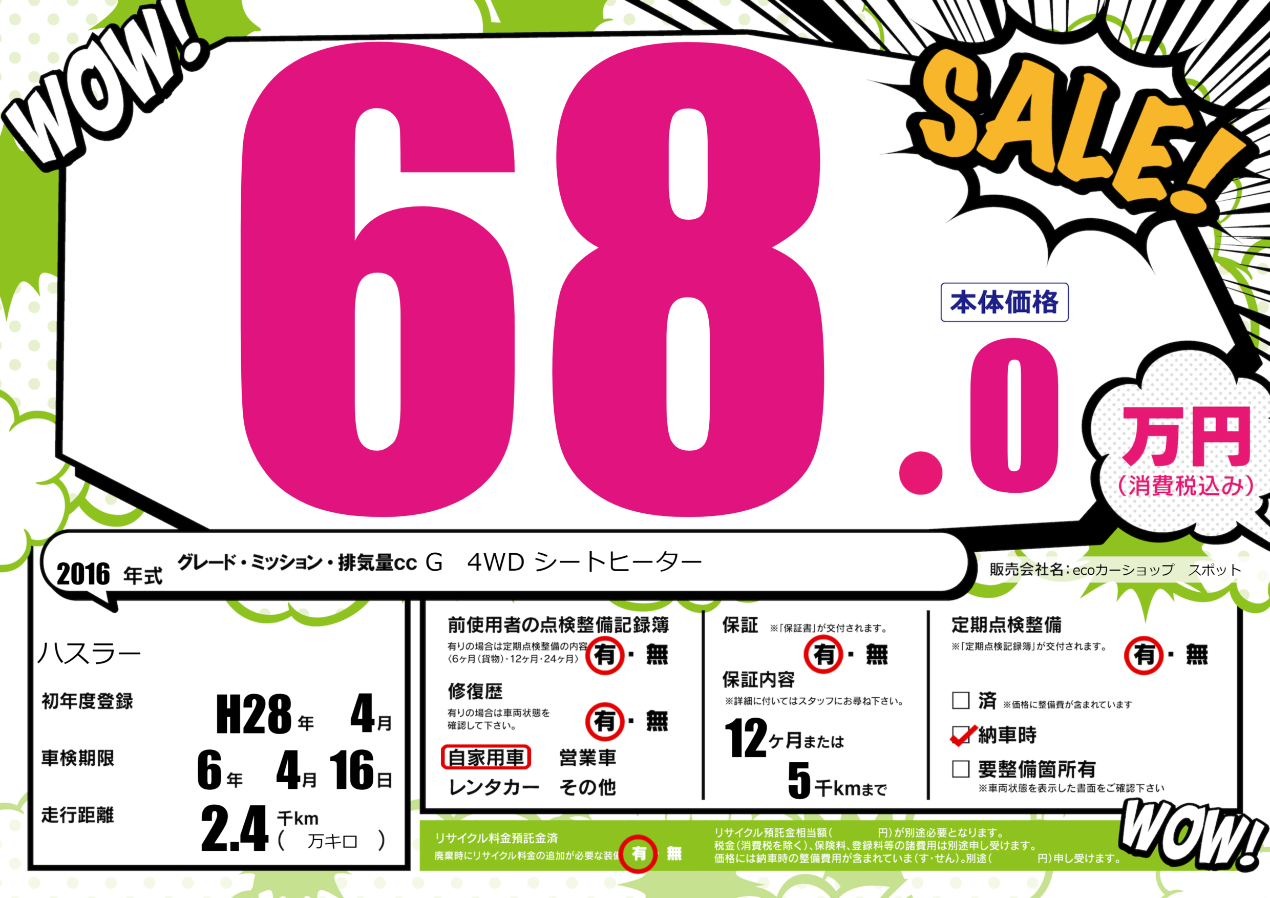 | 車名 | ハスラー | グレード ミッション 排気量 |