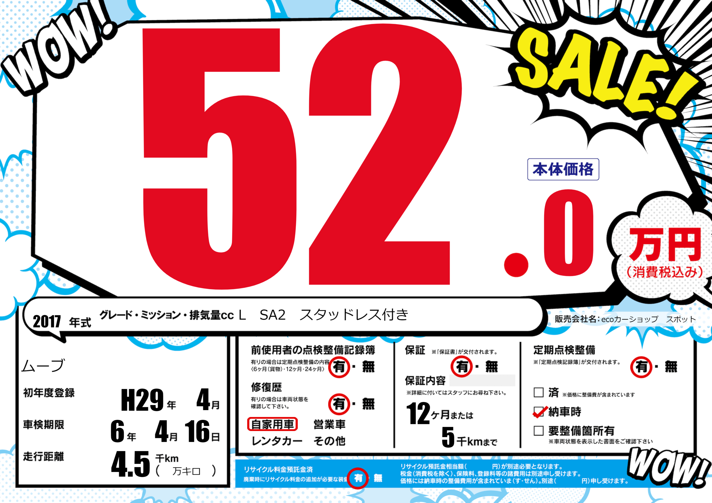 | 走行キロ | 0.4万km | 初年度登録 | H29年4月 |