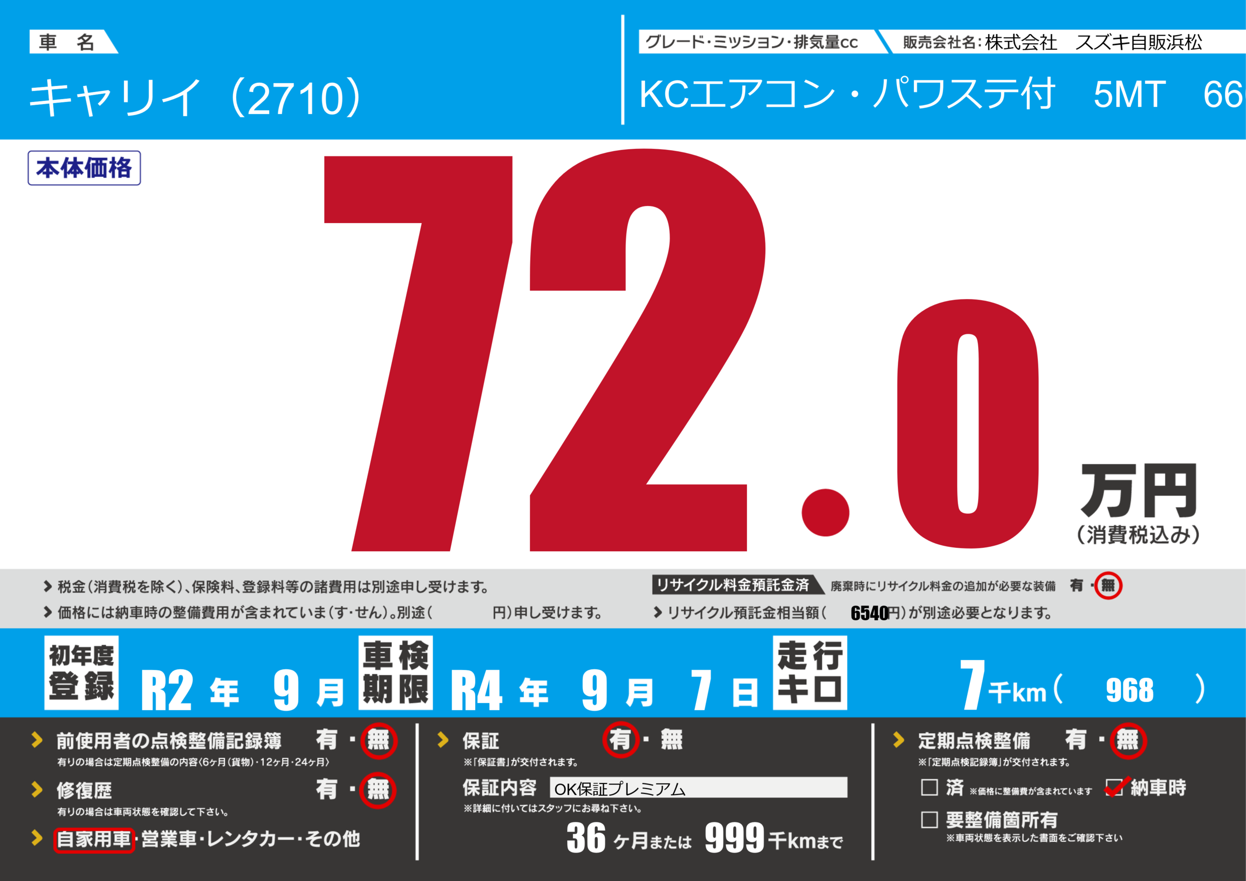 | 車名 | キャリイ(2710) | グレード ミッション 排気量 |