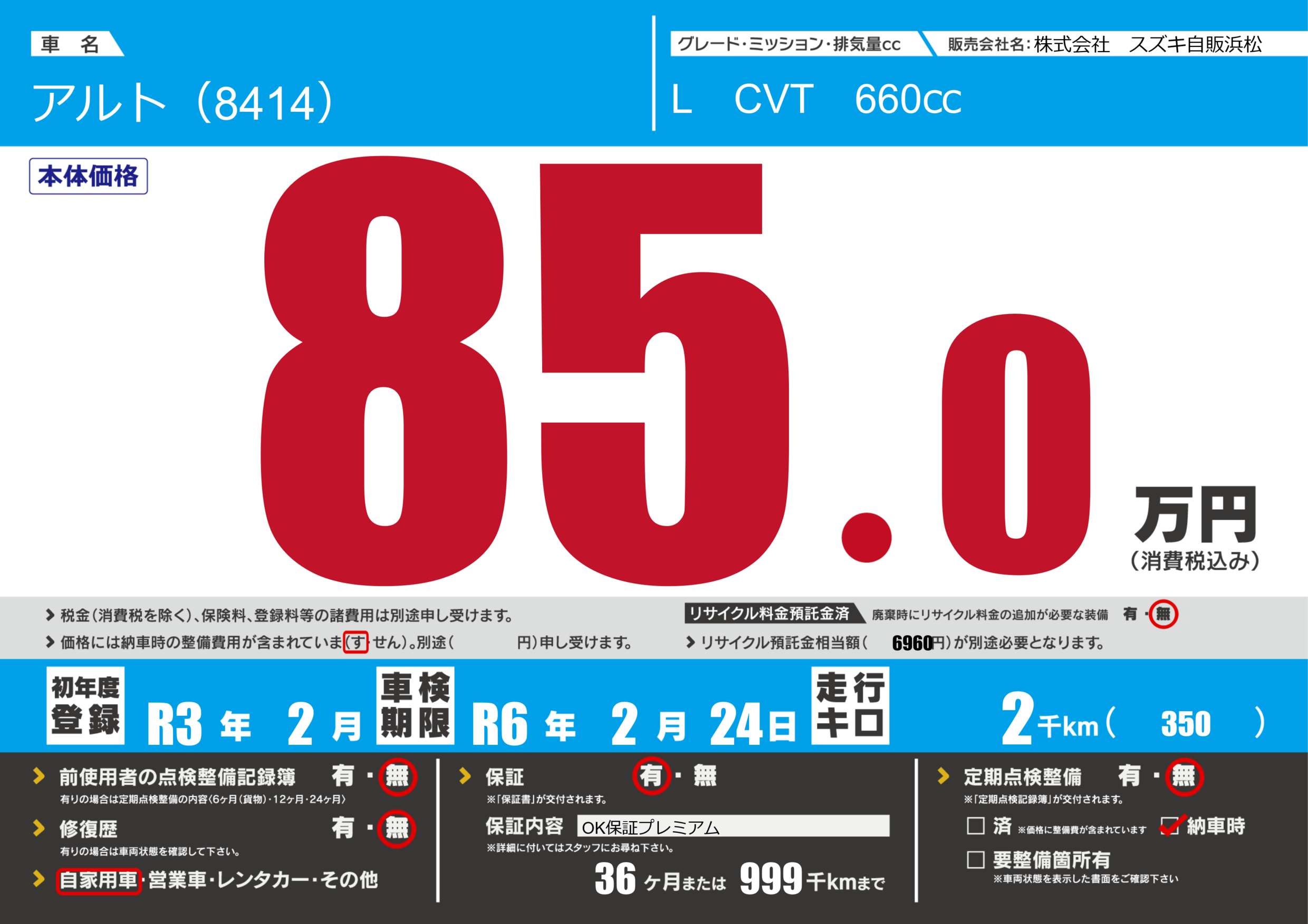 保証付き 保証内容(OK保証プレミアム) 36ヶ月または(999)千kmまで |