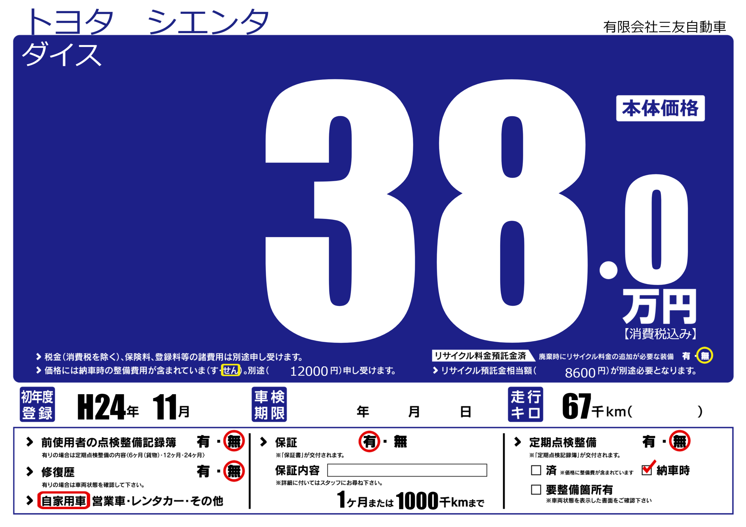 | 車名 | トヨタ シエンタ | グレード ミッション 排気量 |