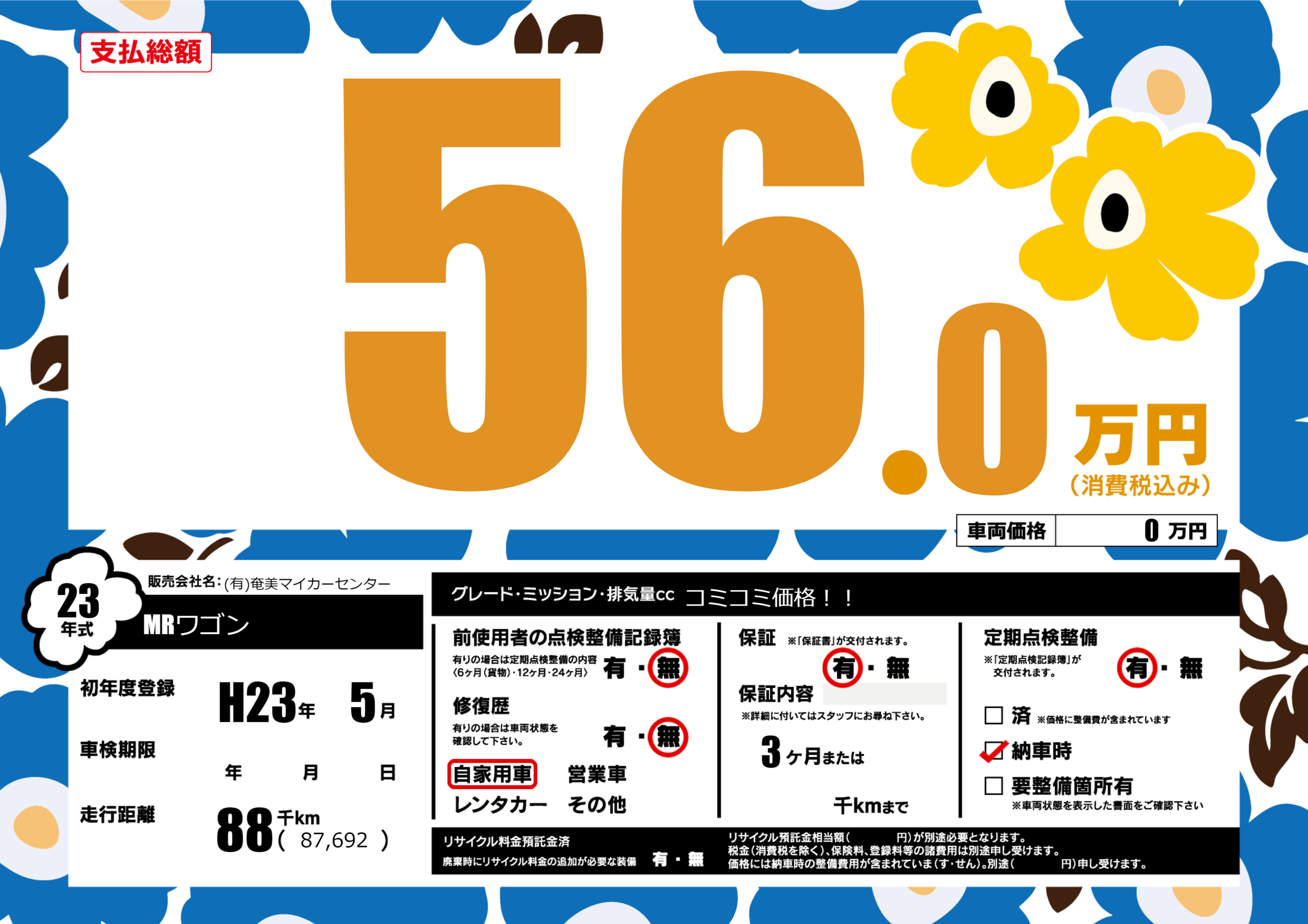 | 走行キロ | 8.8万km | 初年度登録 | H23年5月 |