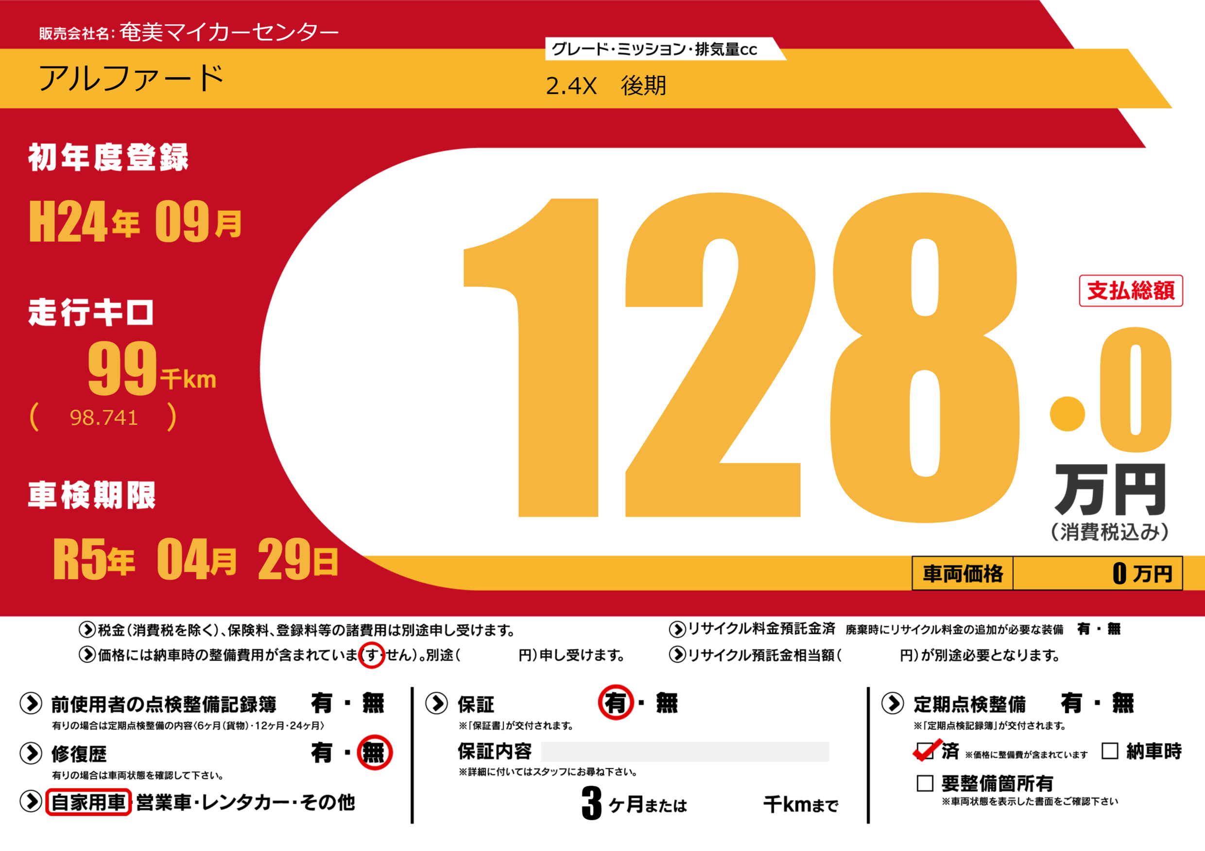 | 走行キロ | 9.9万km | 初年度登録 | H24年09月 |