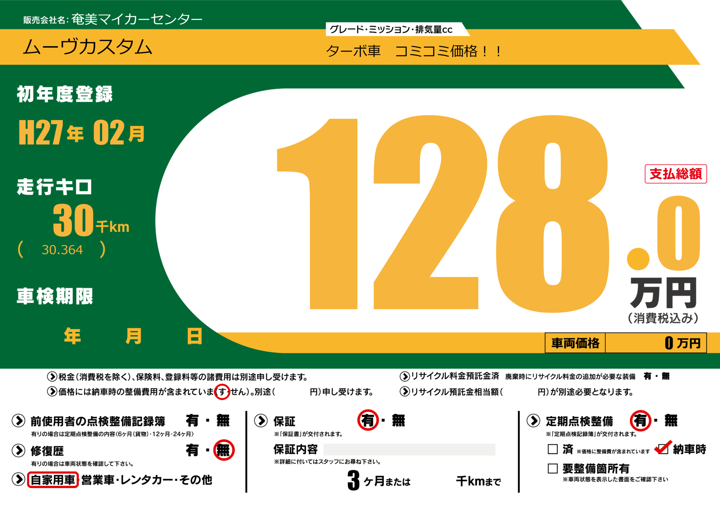| 走行キロ | 3万km | 初年度登録 | H27年02月 |