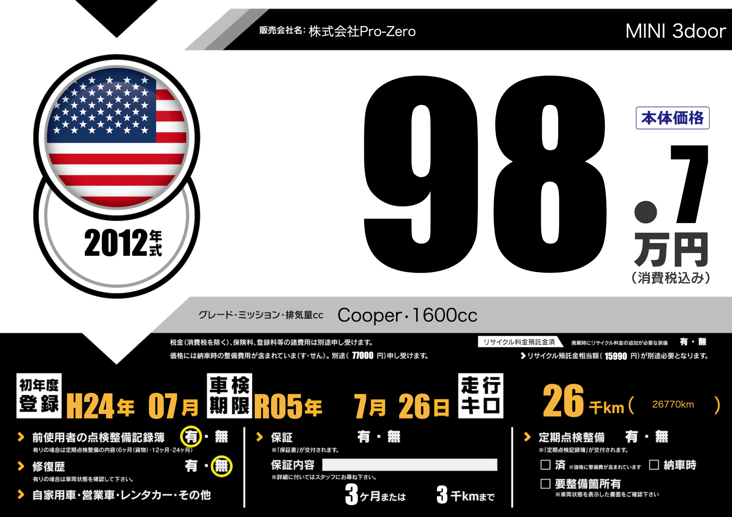 | 車名 | MINI 3door | グレード ミッション 排気量 |