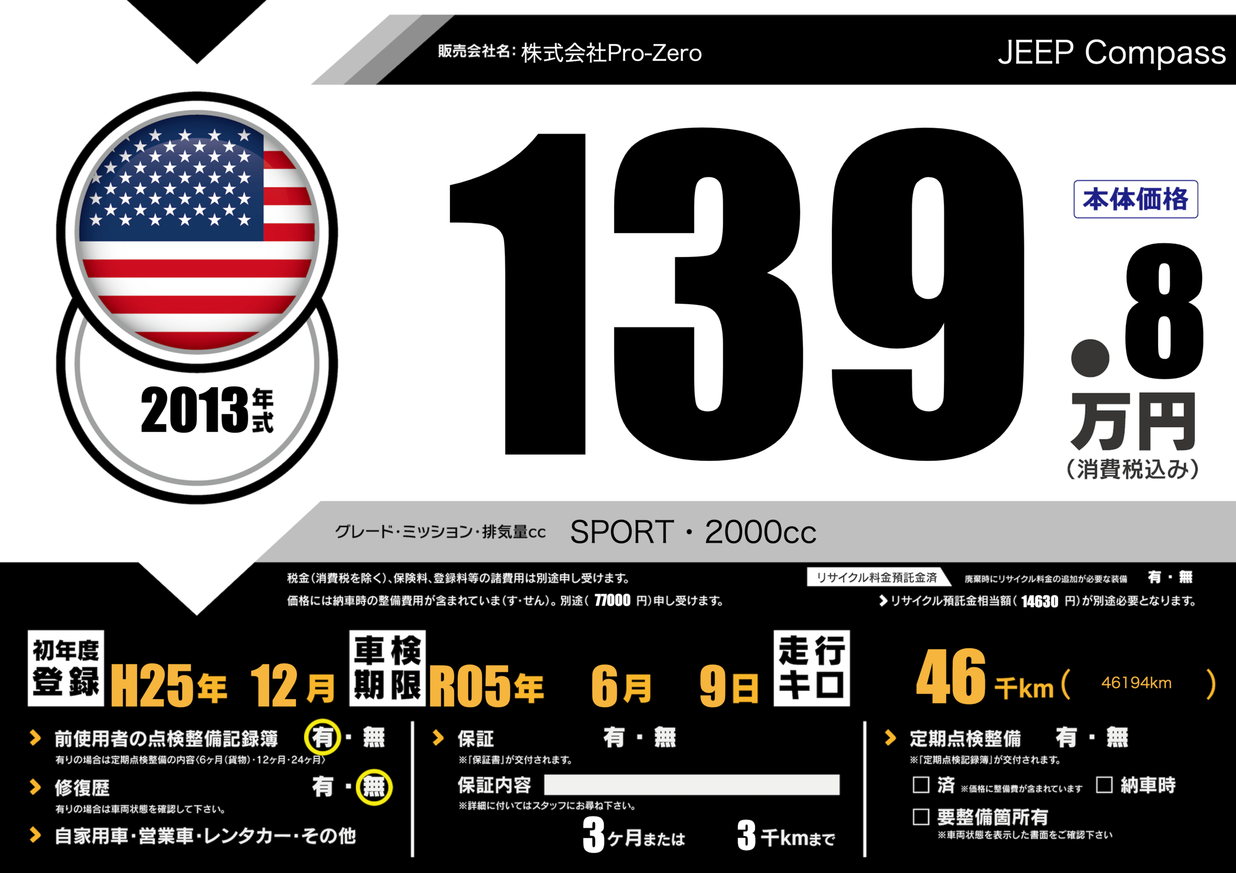 | 車名 | JEEP Compass | グレード ミッション 排気量 |