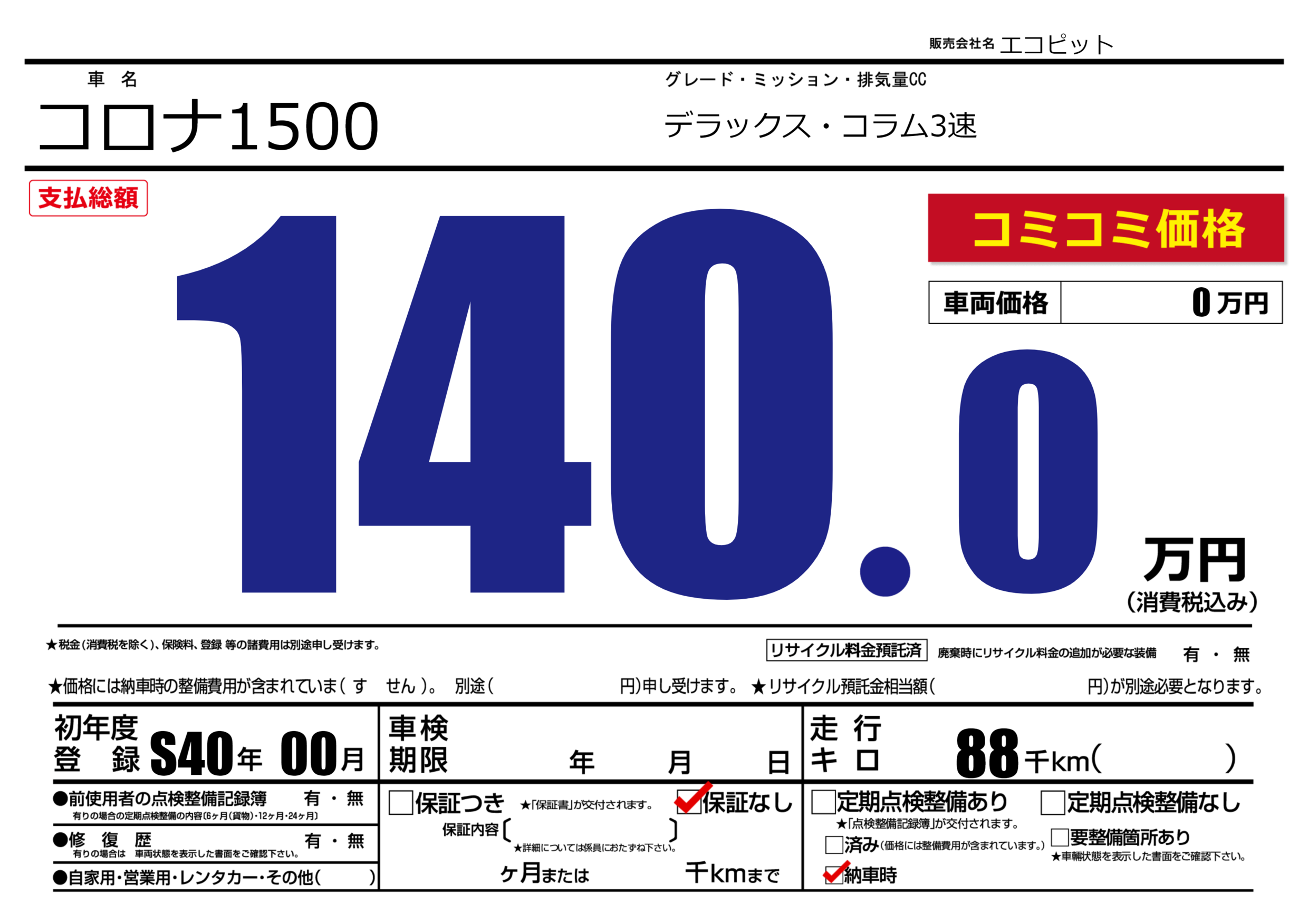| 車名 | コロナ1500 | グレード ミッション 排気量 |