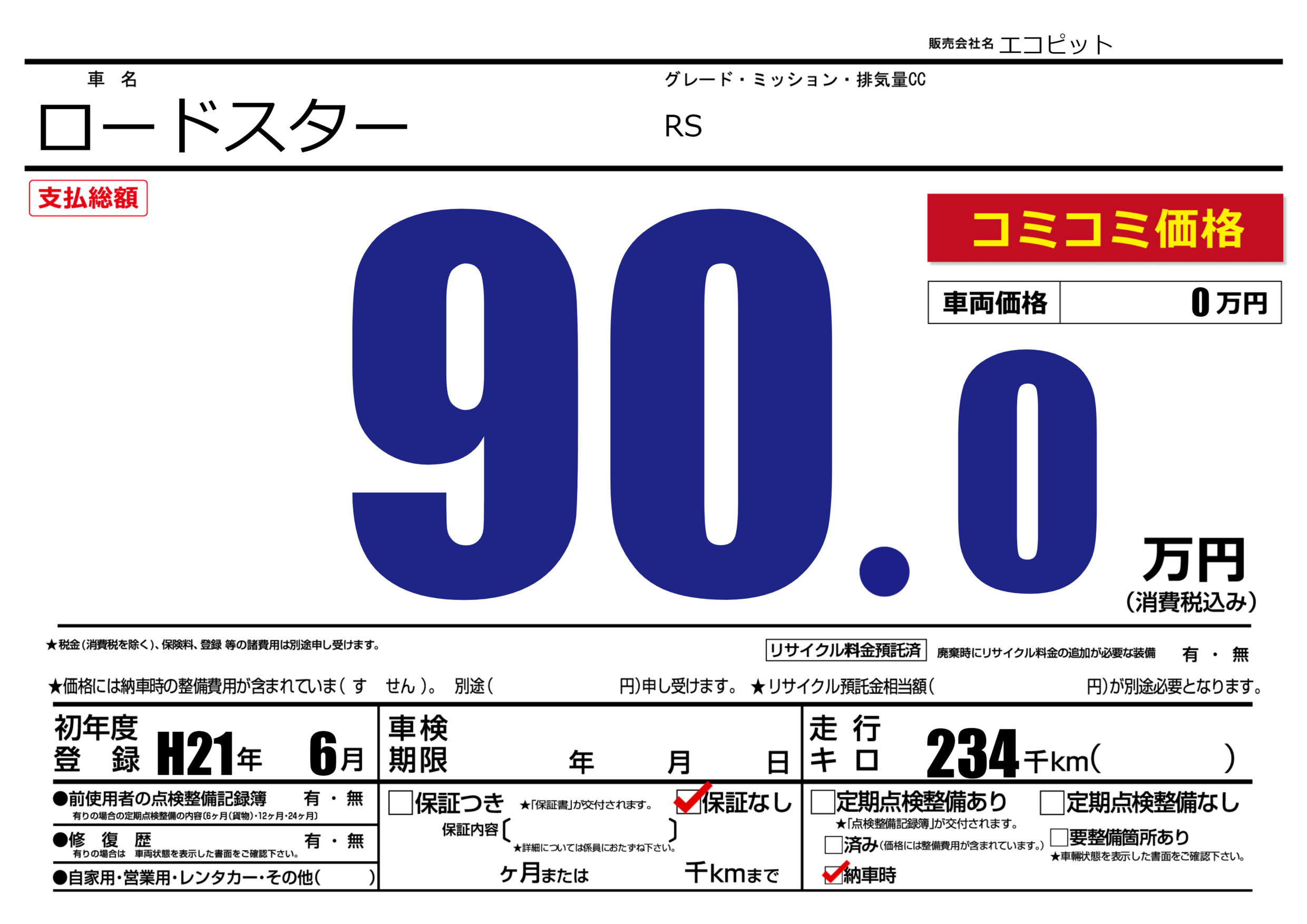 | 車名 | ロードスター | グレード ミッション 排気量 |