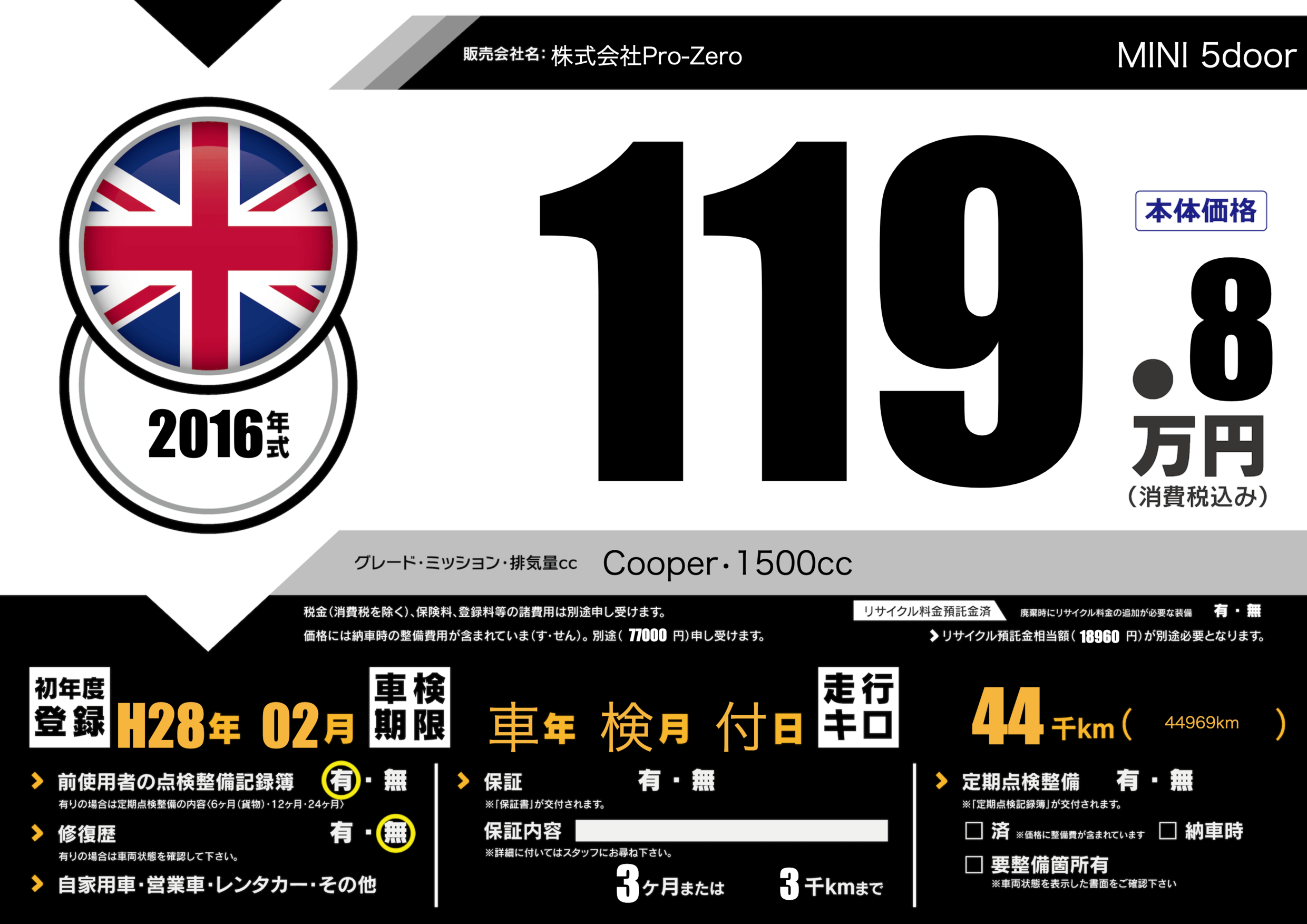 | 車名 | MINI 5door | グレード ミッション 排気量 |