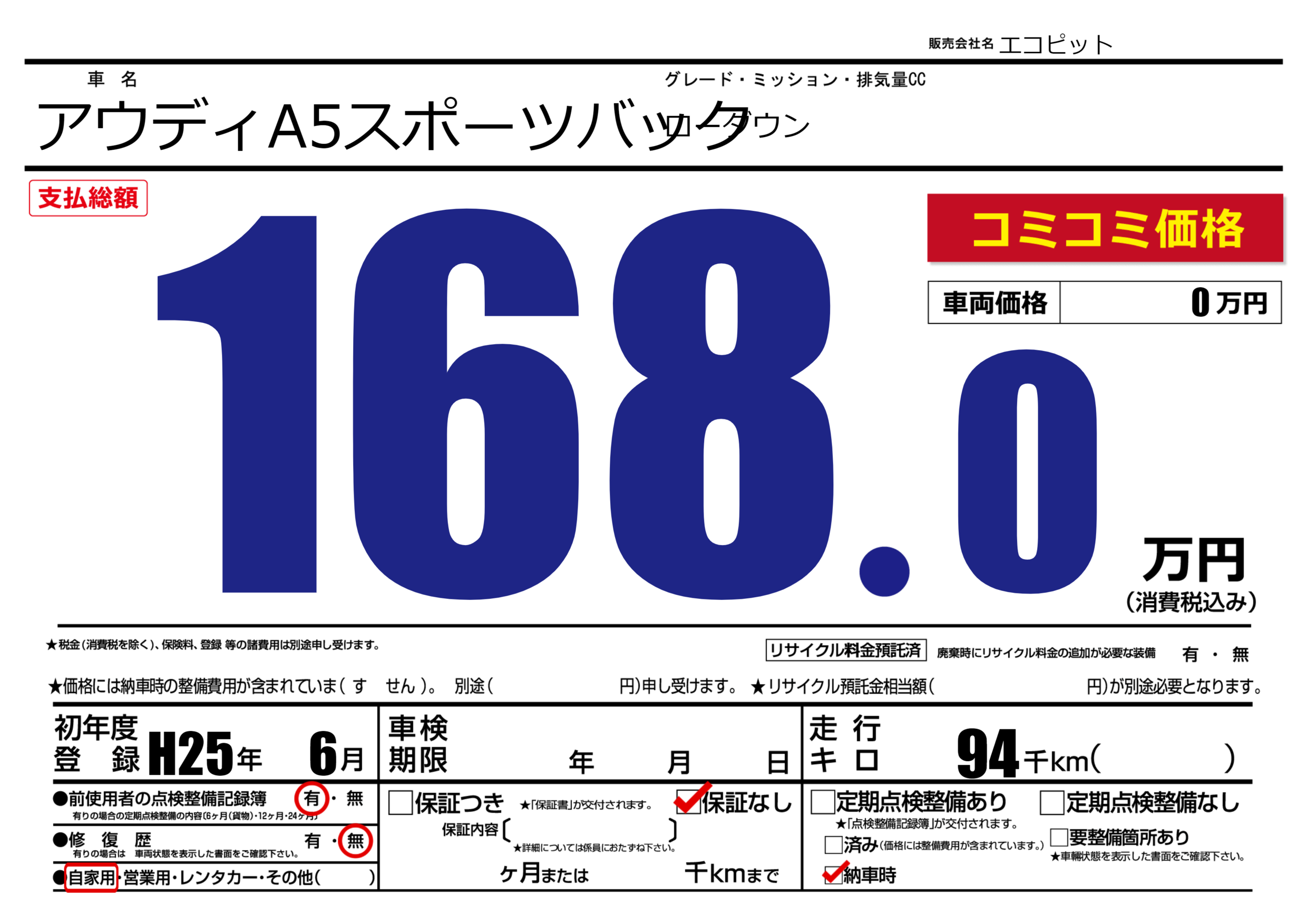 | 車名 | アウディA5スポーツバック | グレード ミッション 排気量 |