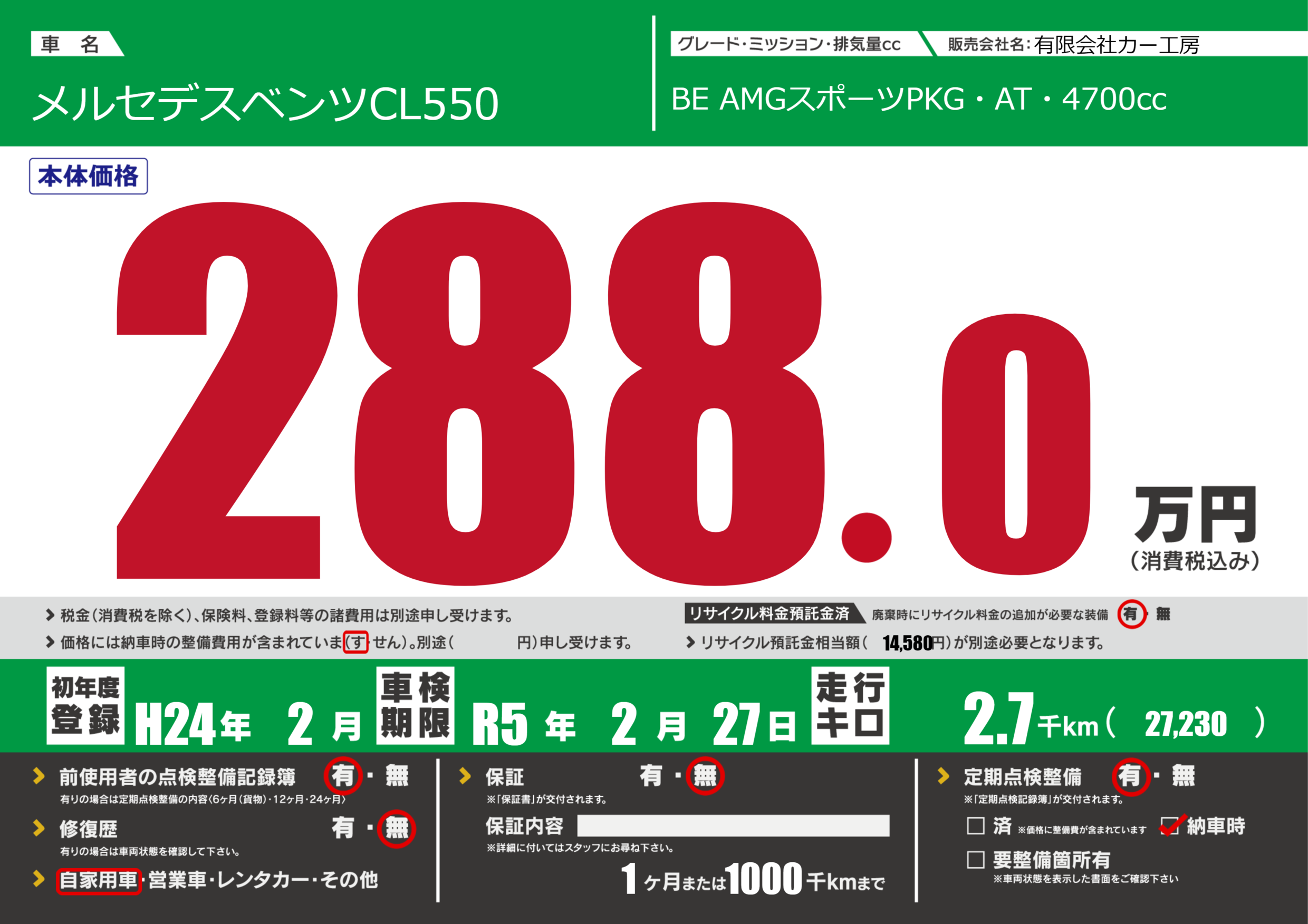 | 車名 | メルセデスベンツCL550 | グレード ミッション 排気量 |