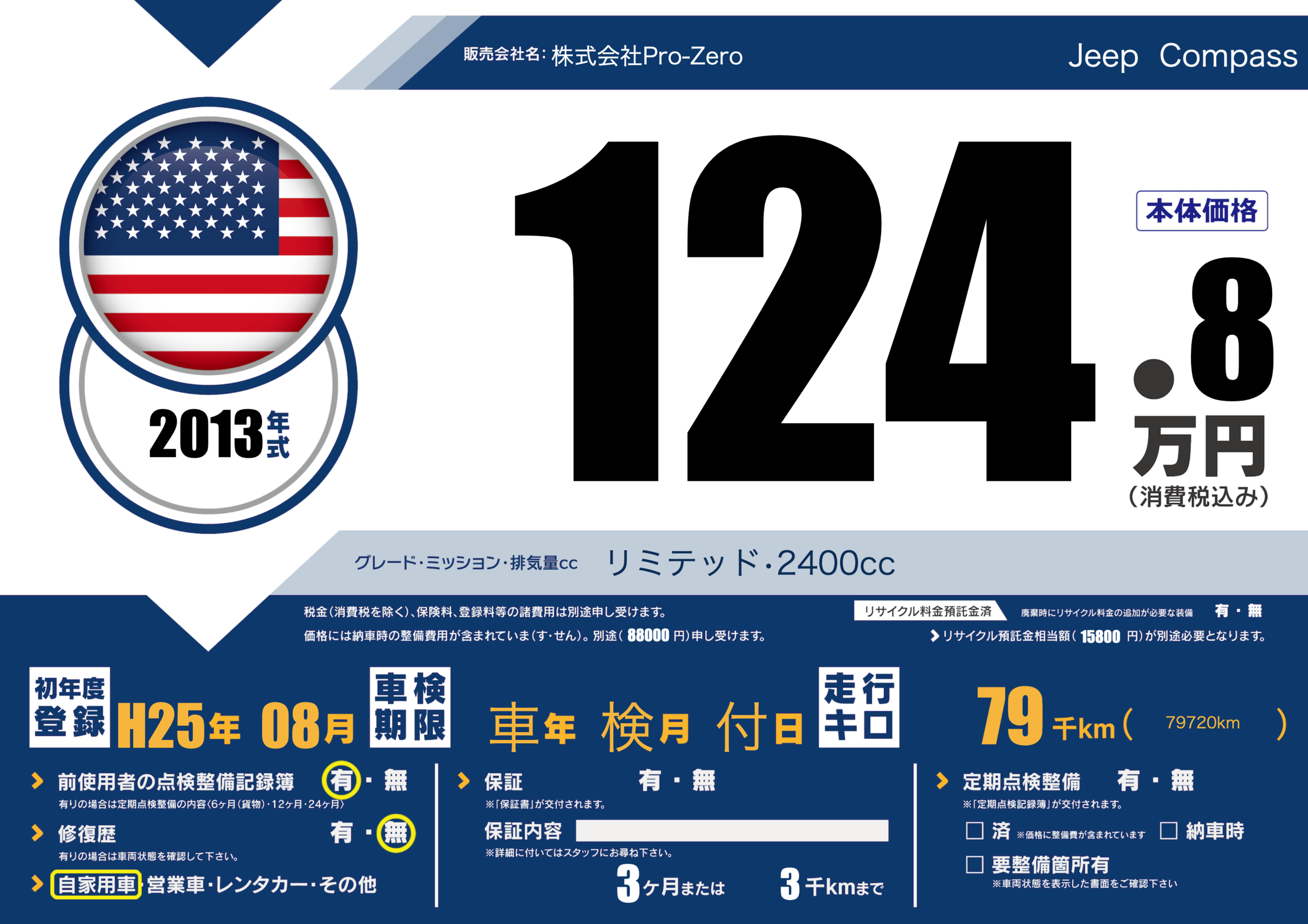 | 車名 | Jeep Compass | グレード ミッション 排気量 |