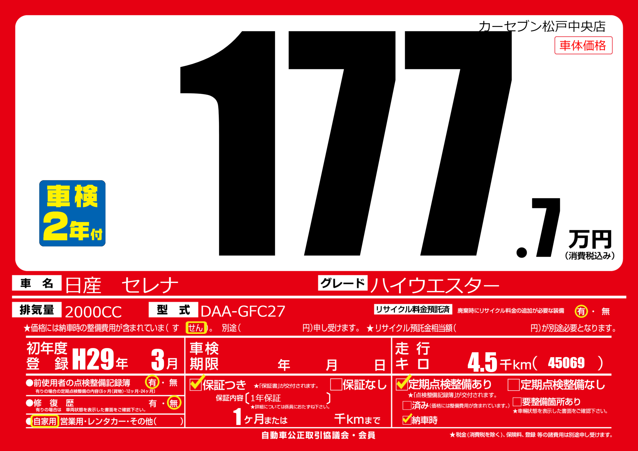 | 車名 | 日産 セレナ | グレード ミッション 排気量 |