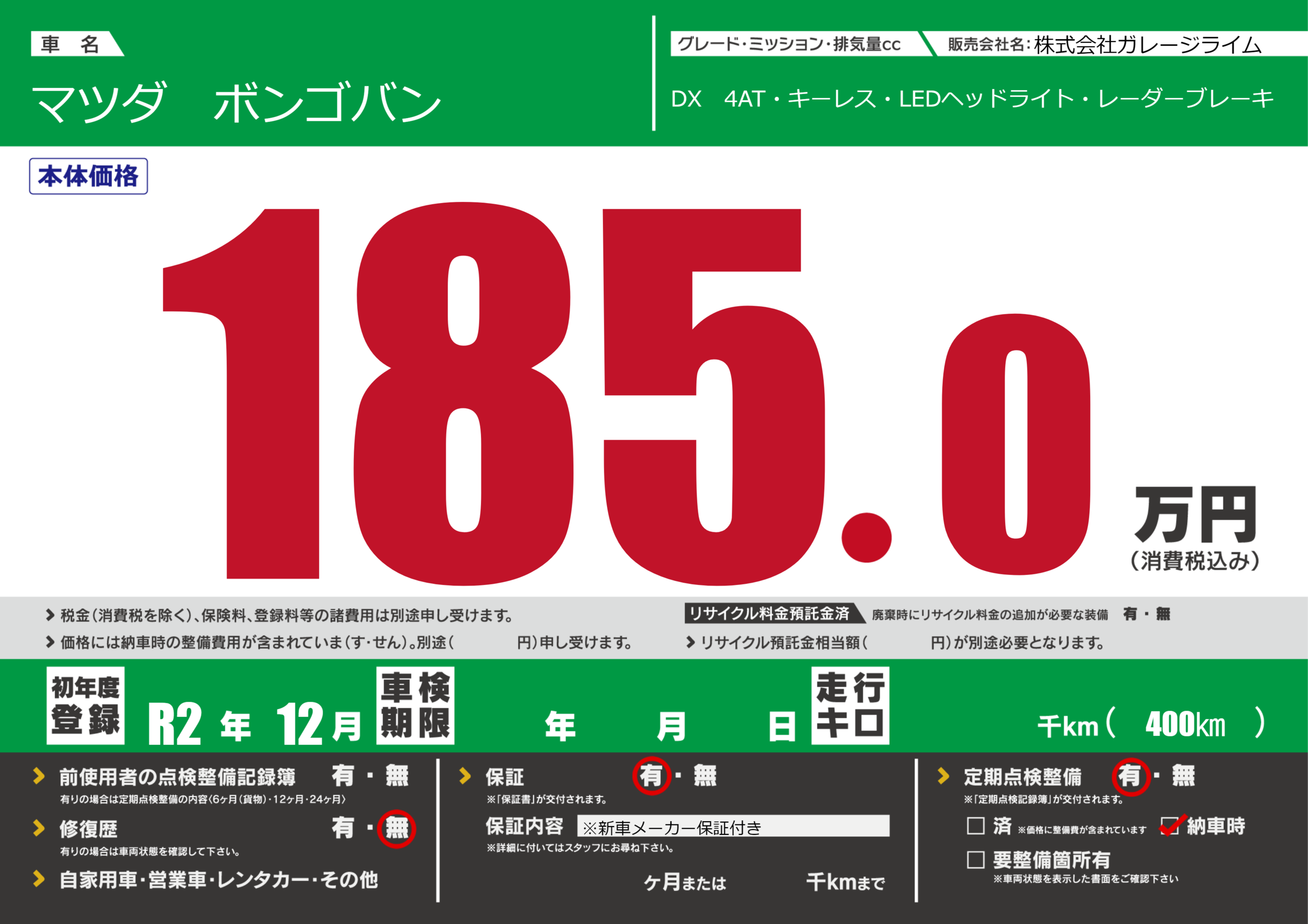 | 走行キロ | - | 初年度登録 | R2年12月 |
