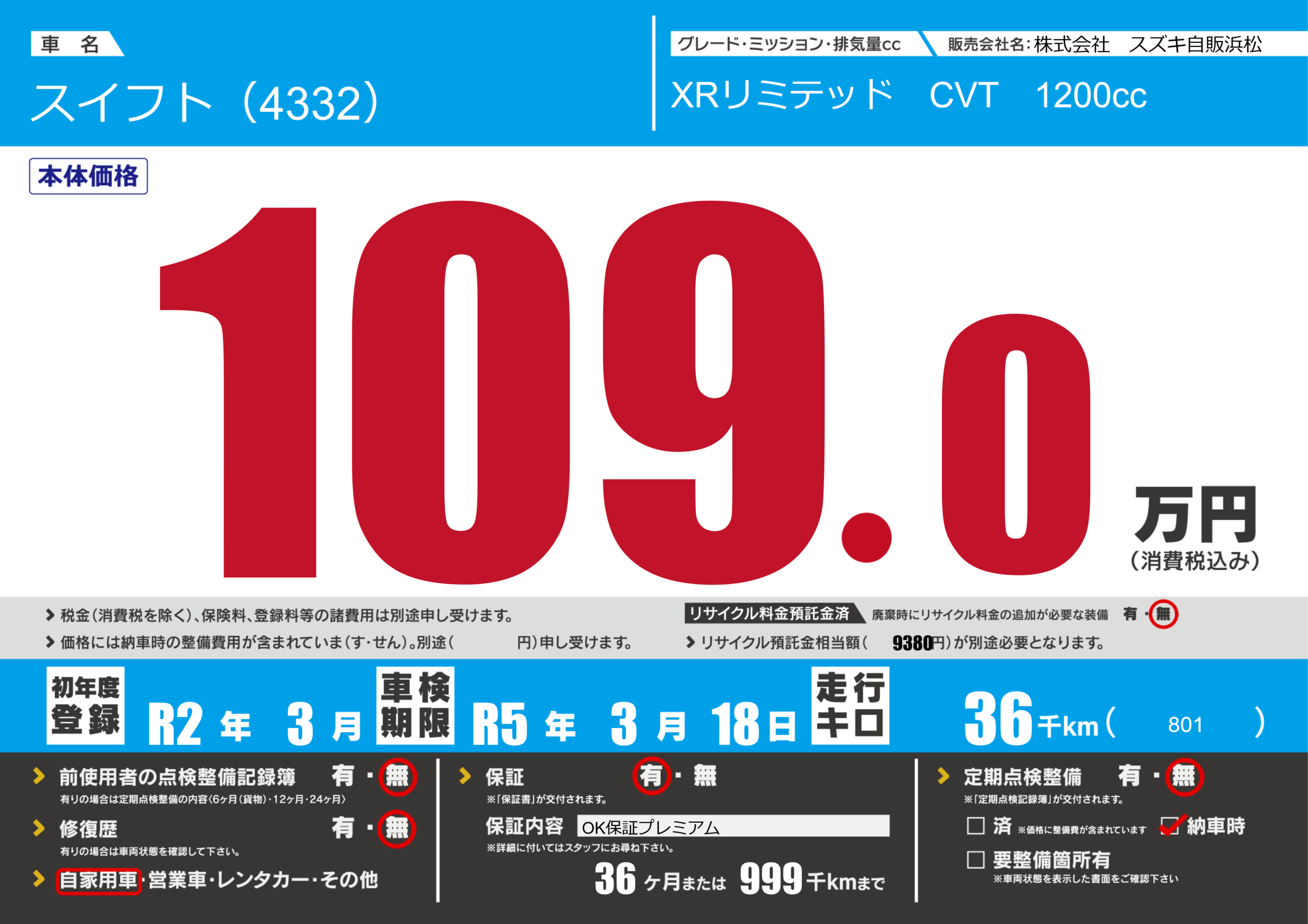 保証付き 保証内容(OK保証プレミアム) 36ヶ月または(999)千kmまで |