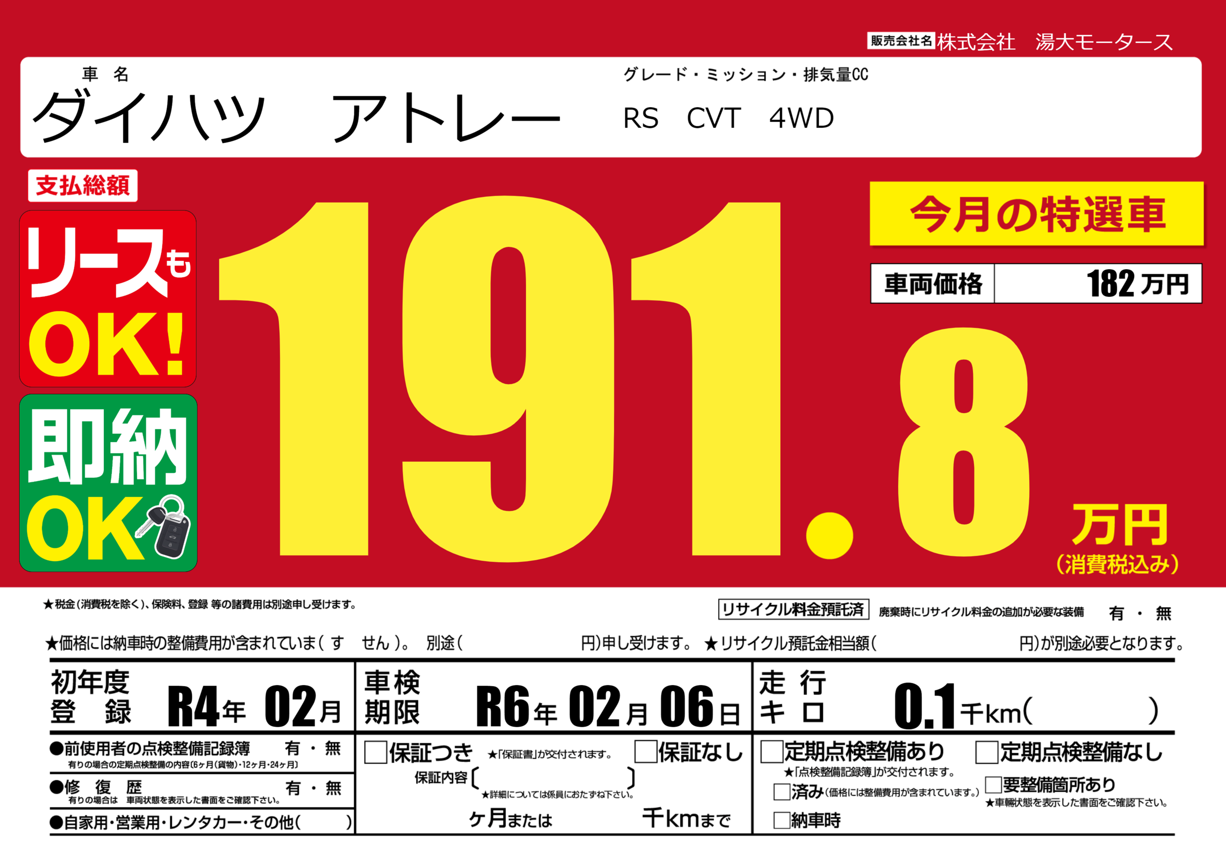 | 車名 | ダイハツ アトレー | グレード ミッション 排気量 |