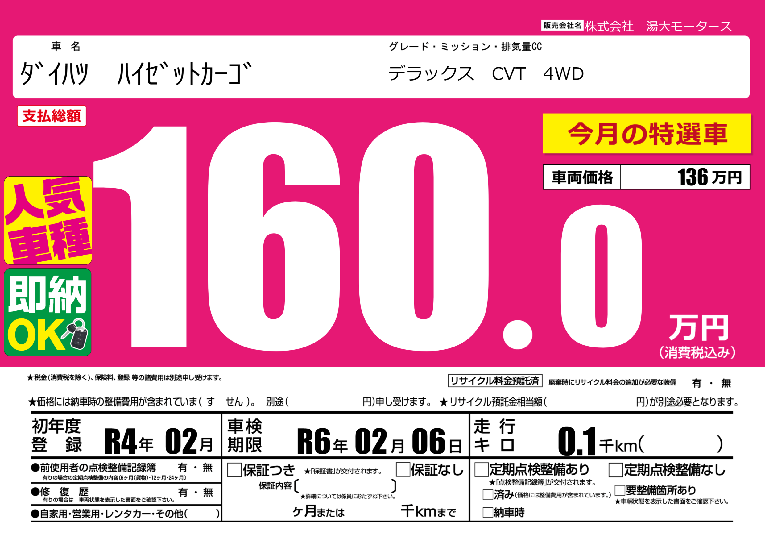 | 車名 | ダイハツ ハイゼットカーゴ | グレード ミッション 排気量 |