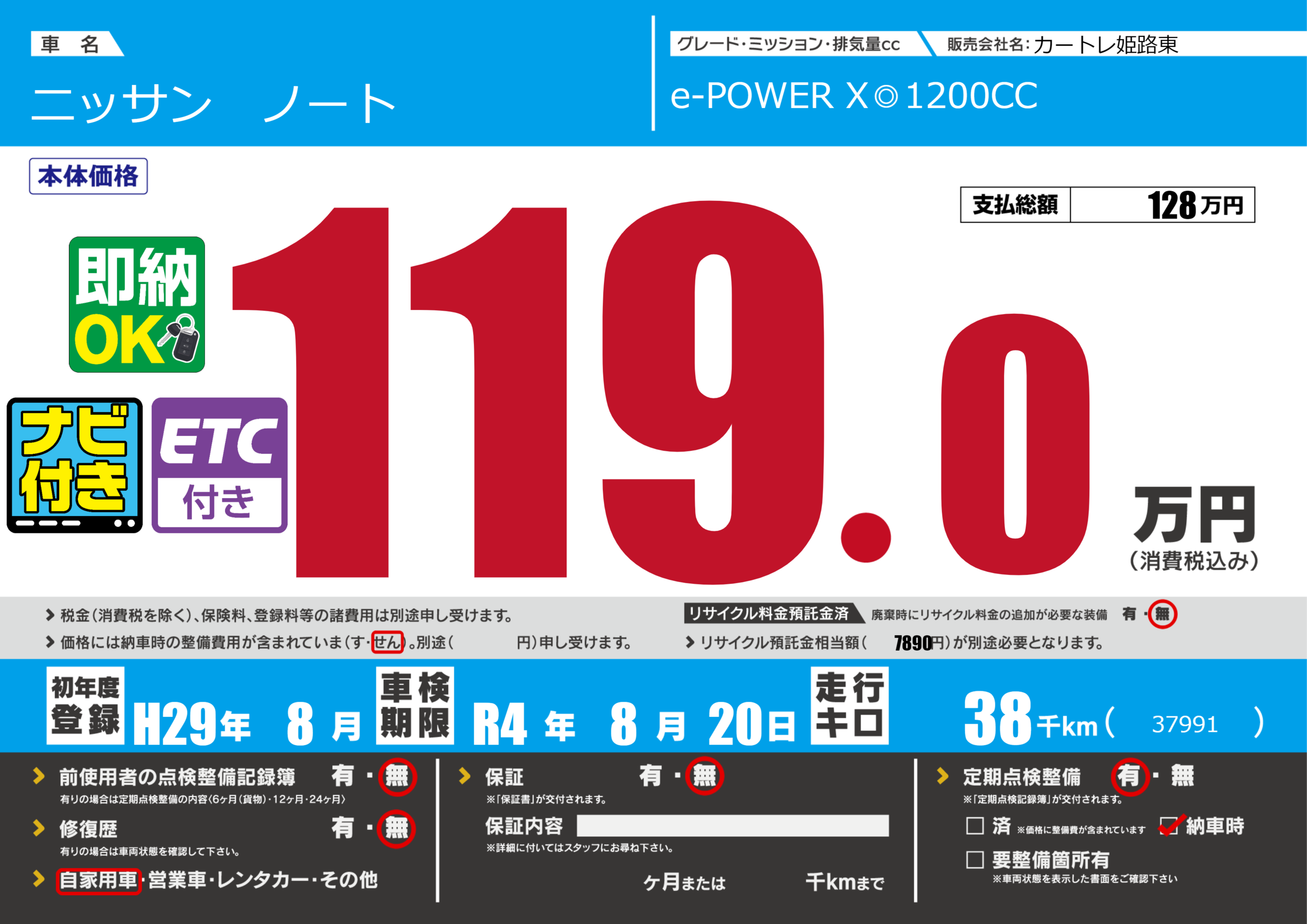 | 走行キロ | 3.8万km | 初年度登録 | H29年8月 |