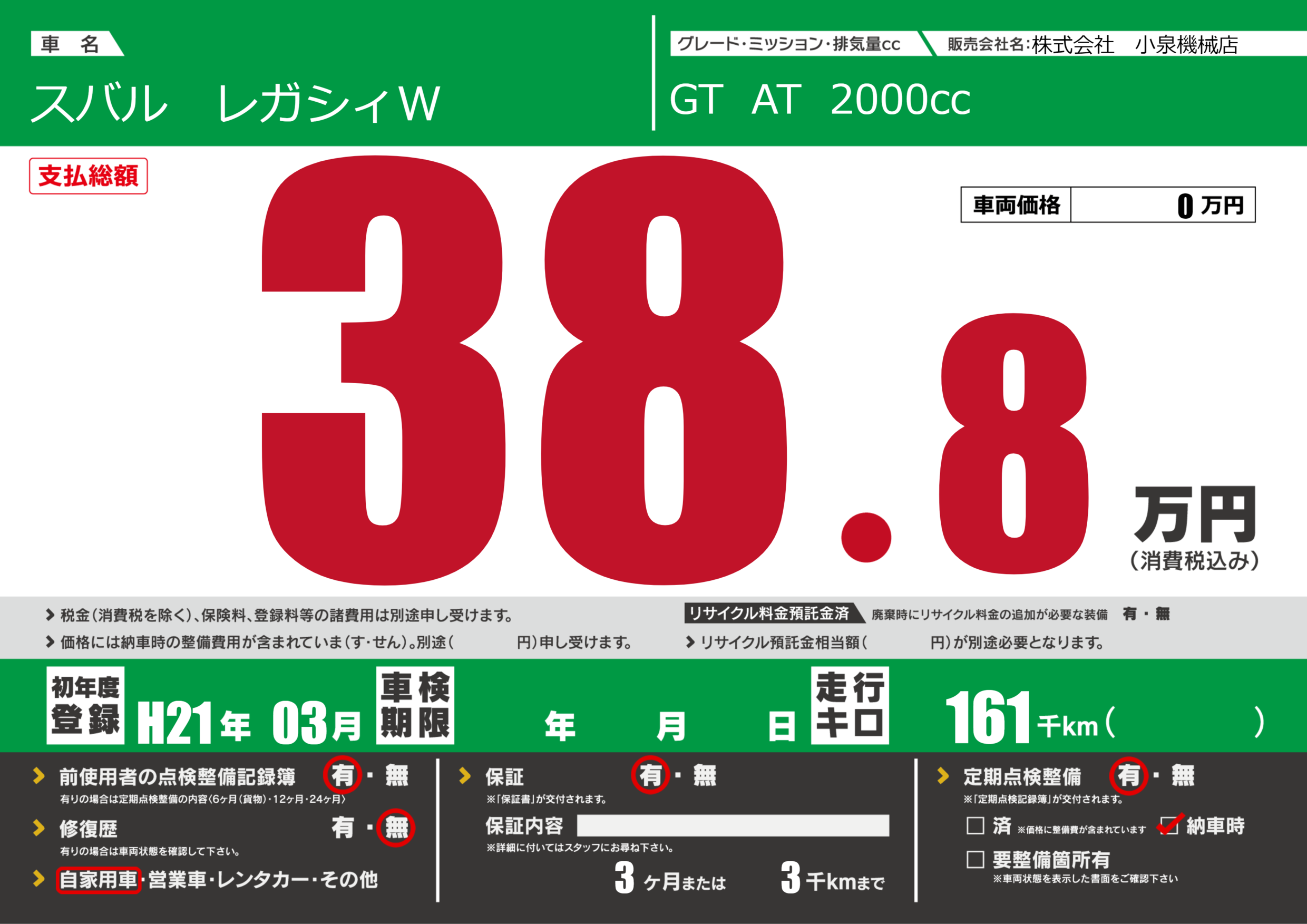 | 車名 | スバル レガシィW | グレード ミッション 排気量 |