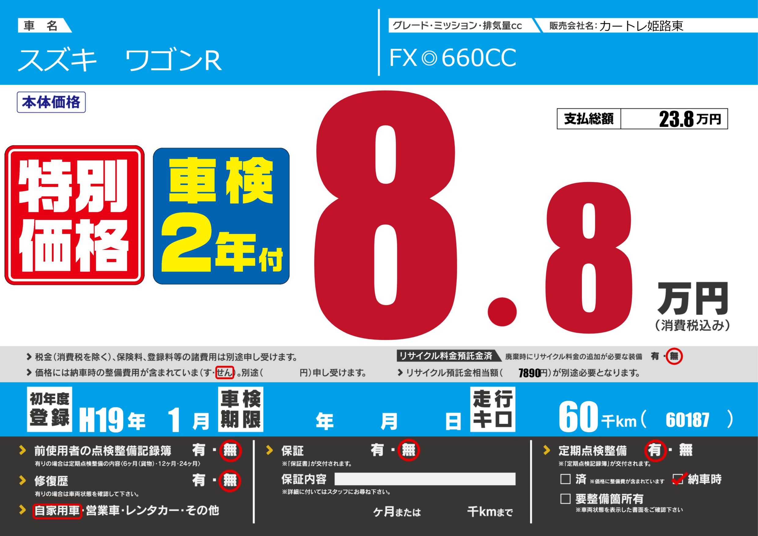 | 走行キロ | 6万km | 初年度登録 | H19年1月 |