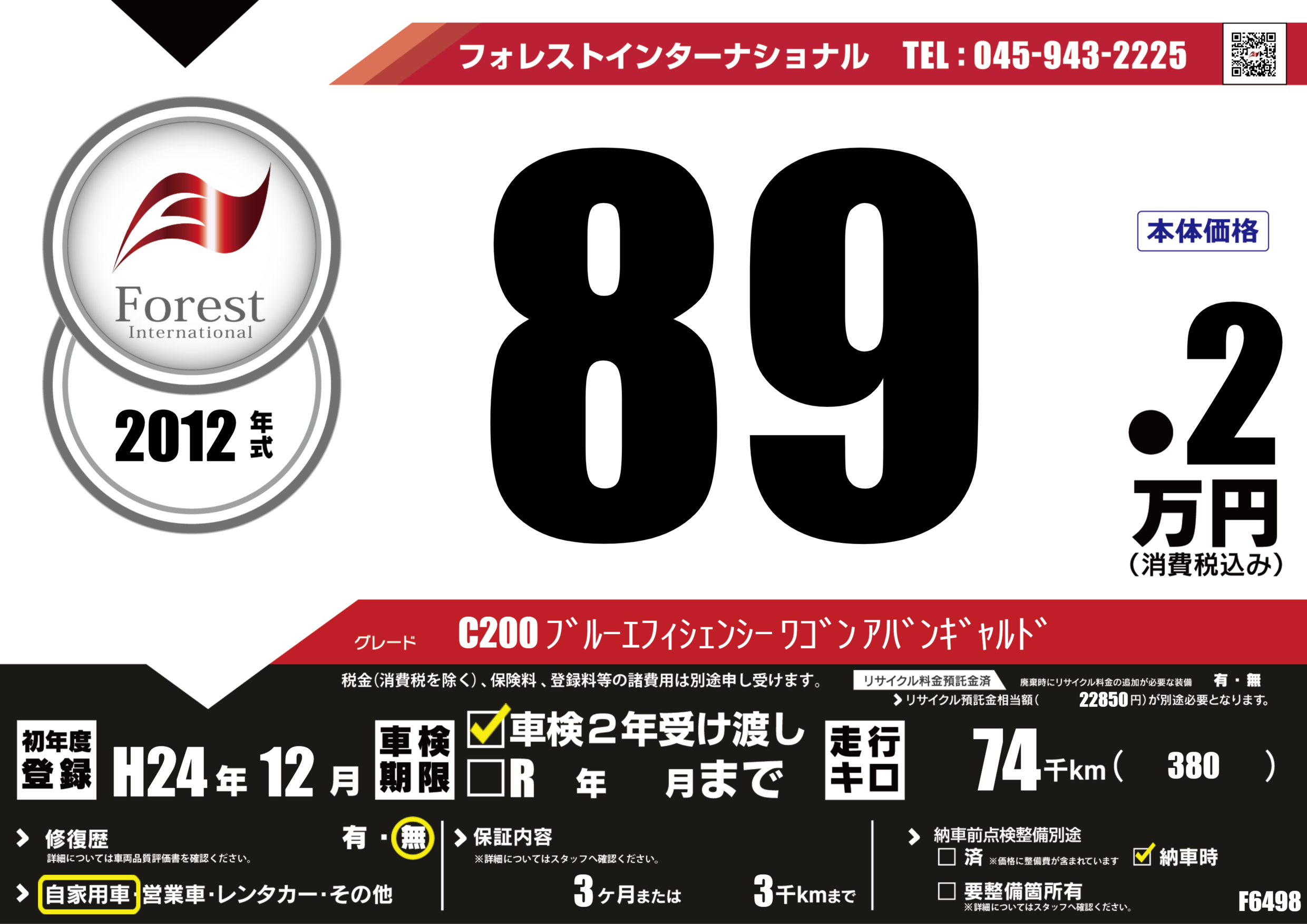 | 走行キロ | 7.4万km | 初年度登録 | H24年12月 |