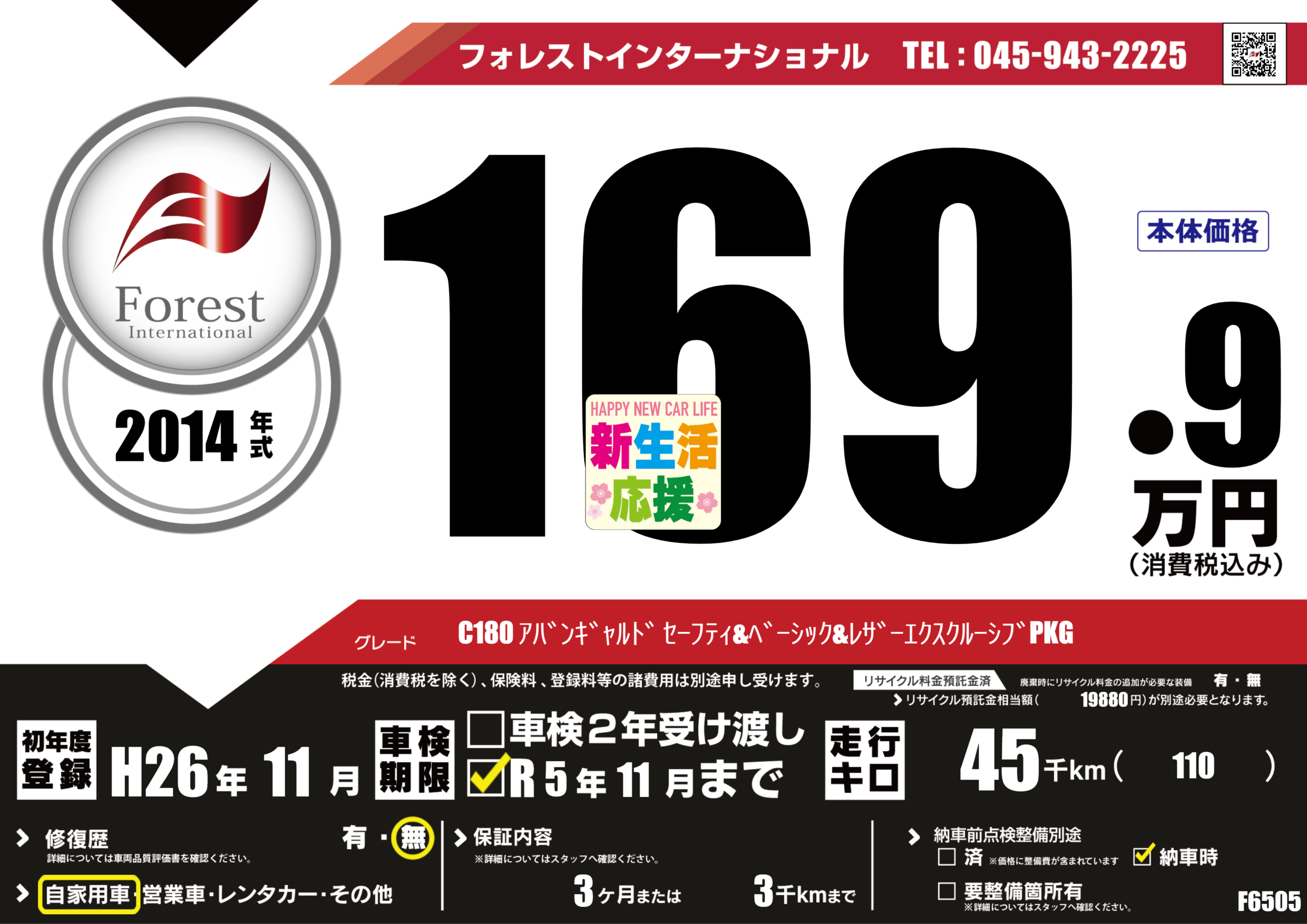 | 走行キロ | 4.5万km | 初年度登録 | H26年11月 |