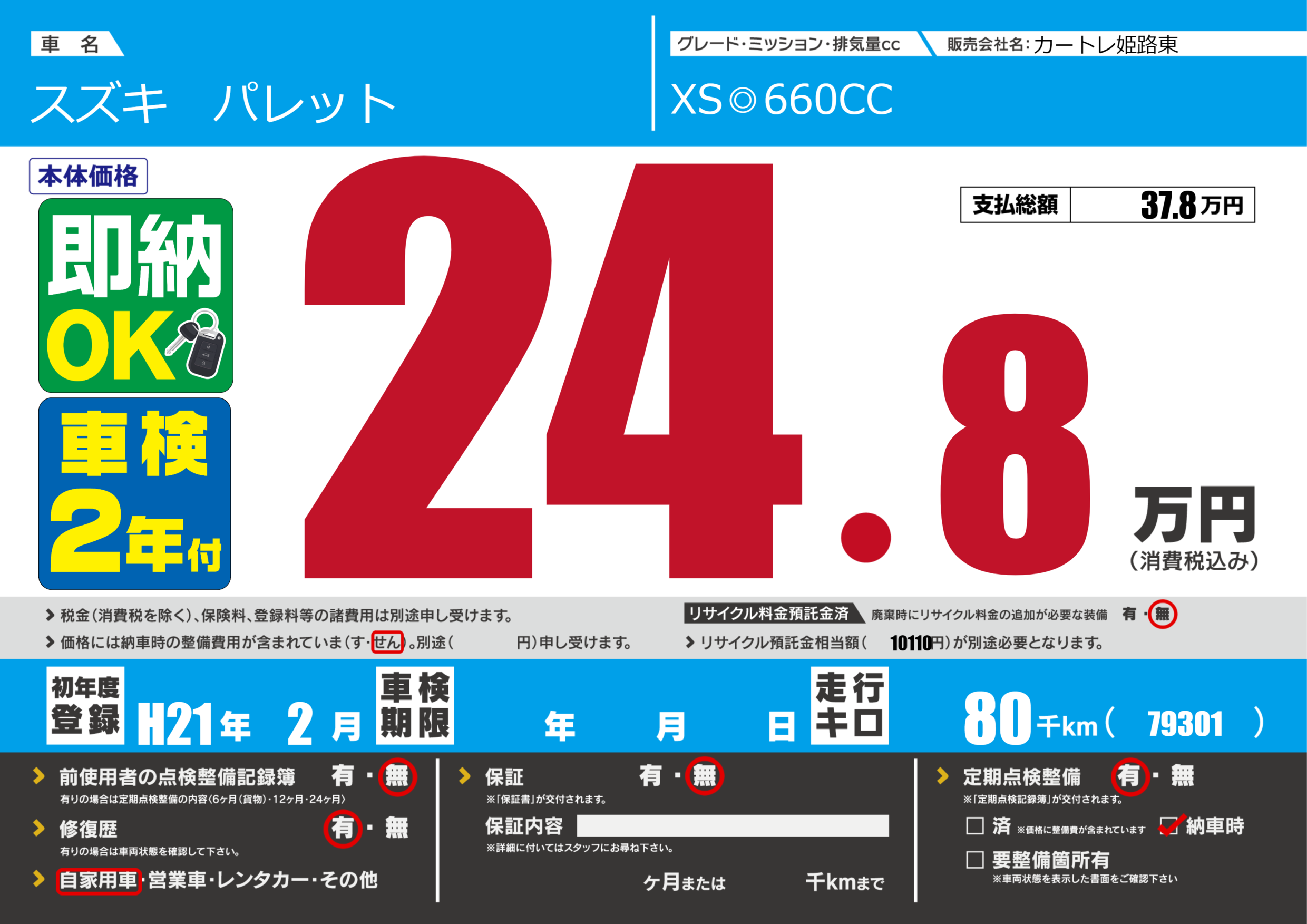 | 車名 | スズキ パレット | グレード ミッション 排気量 |