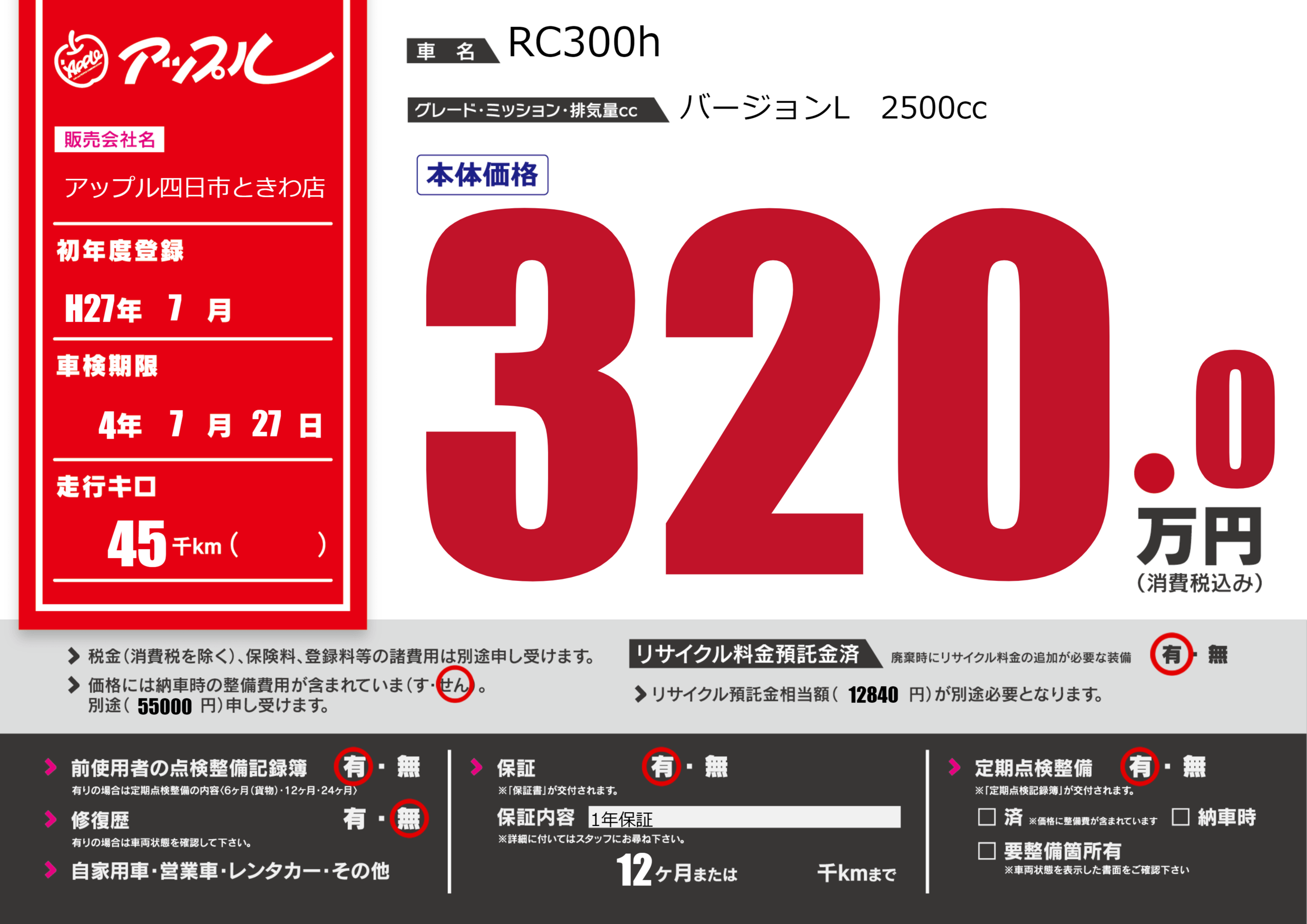 | 車名 | RC300h | グレード ミッション 排気量 |