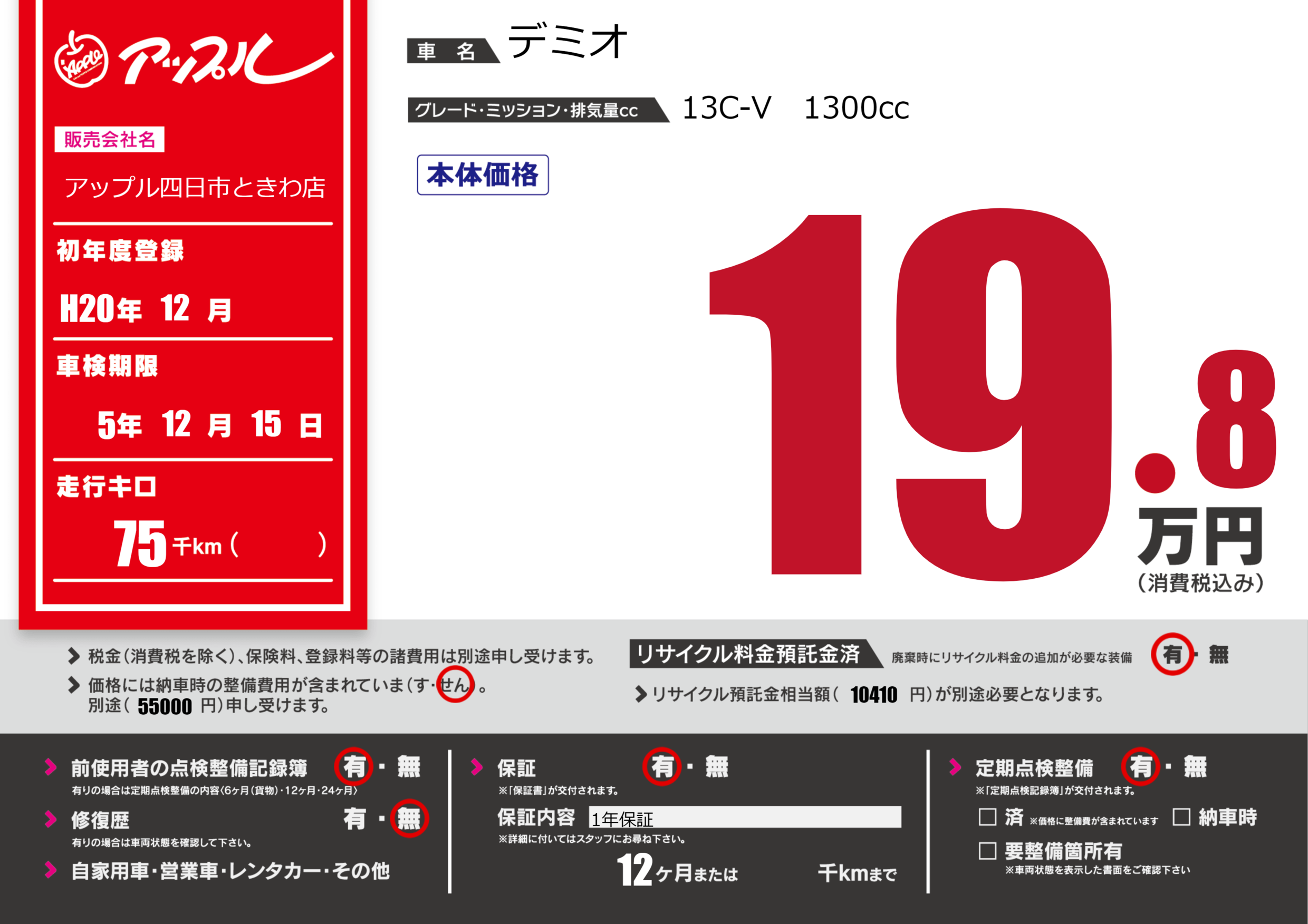 | 車名 | デミオ | グレード ミッション 排気量 |