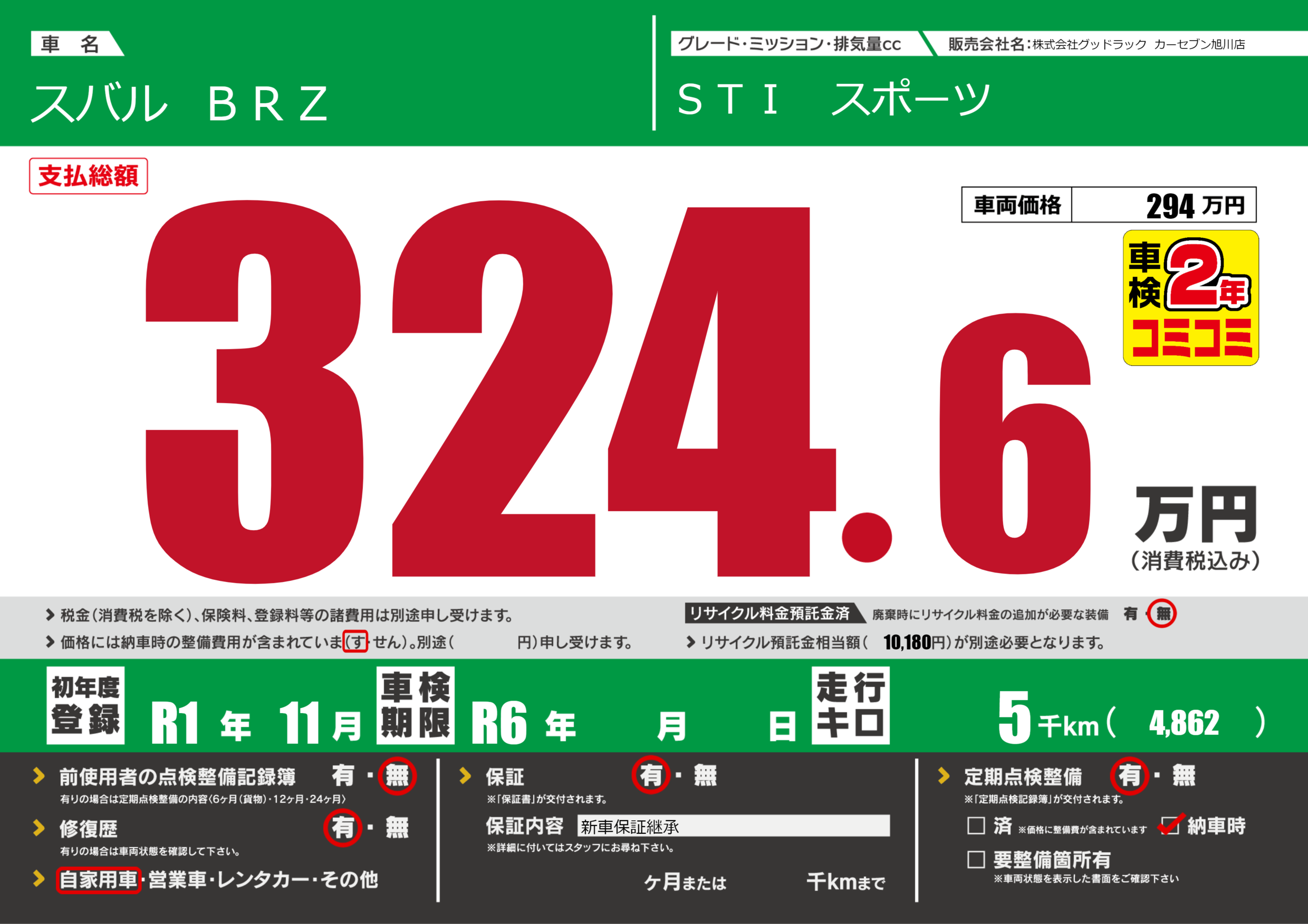 | 車名 | スバル BRZ | グレード ミッション 排気量 |