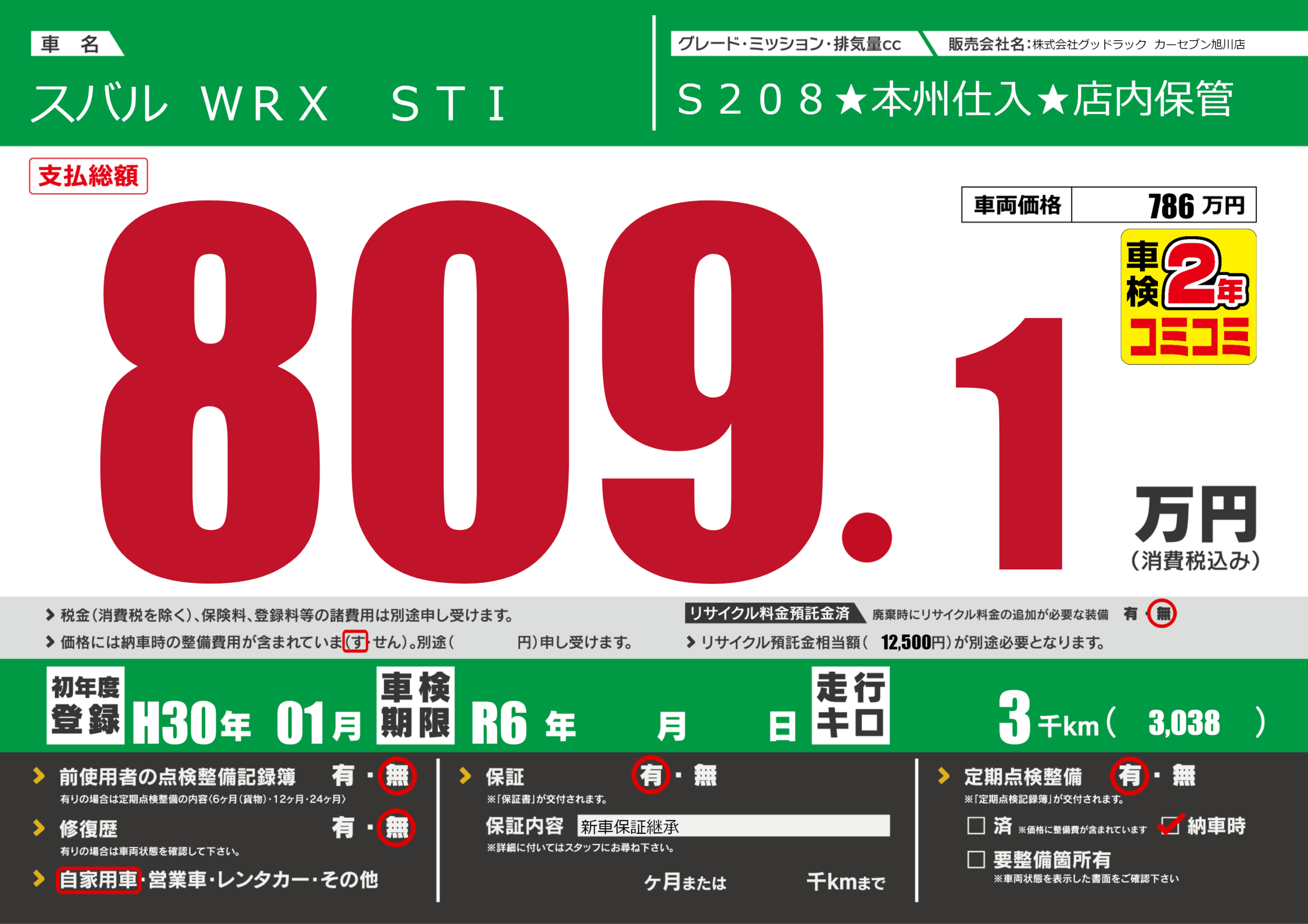 | 車名 | スバル WRX STI | グレード ミッション 排気量 |