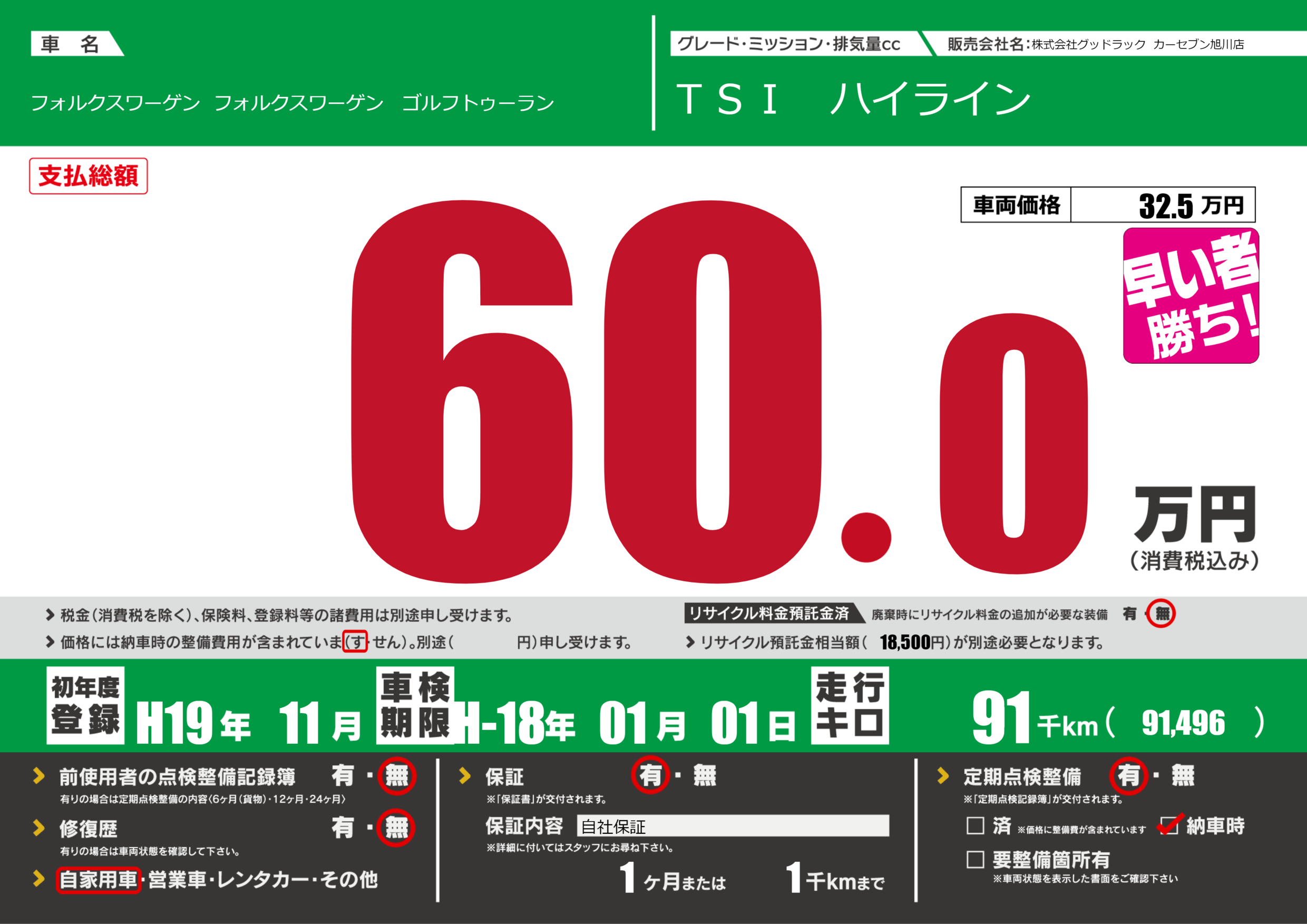 | 車名 | フォルクスワーゲン フォルクスワーゲン ゴルフトゥーラン | グレード ミッション 排気量 |
