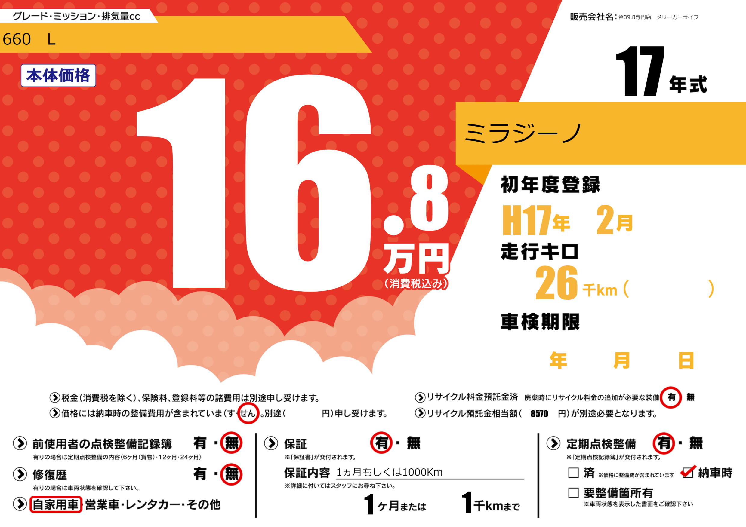 | 車名 | ミラジーノ | グレード ミッション 排気量 |