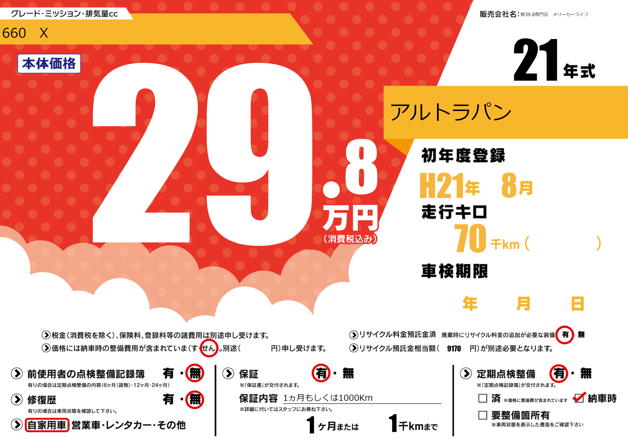 | 走行キロ | 7万km | 初年度登録 | H21年8月 |