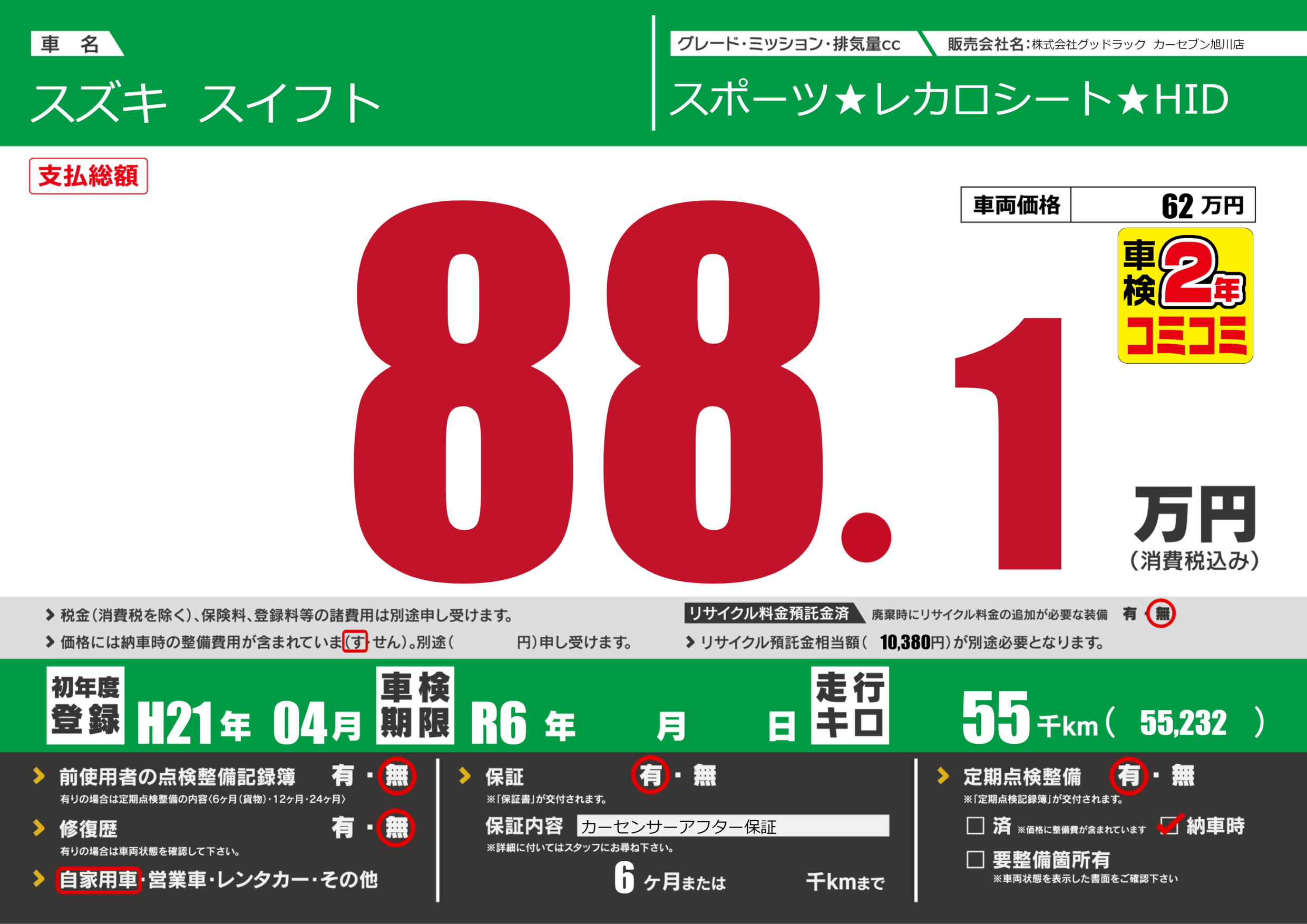 | 車名 | スズキ スイフト | グレード ミッション 排気量 |