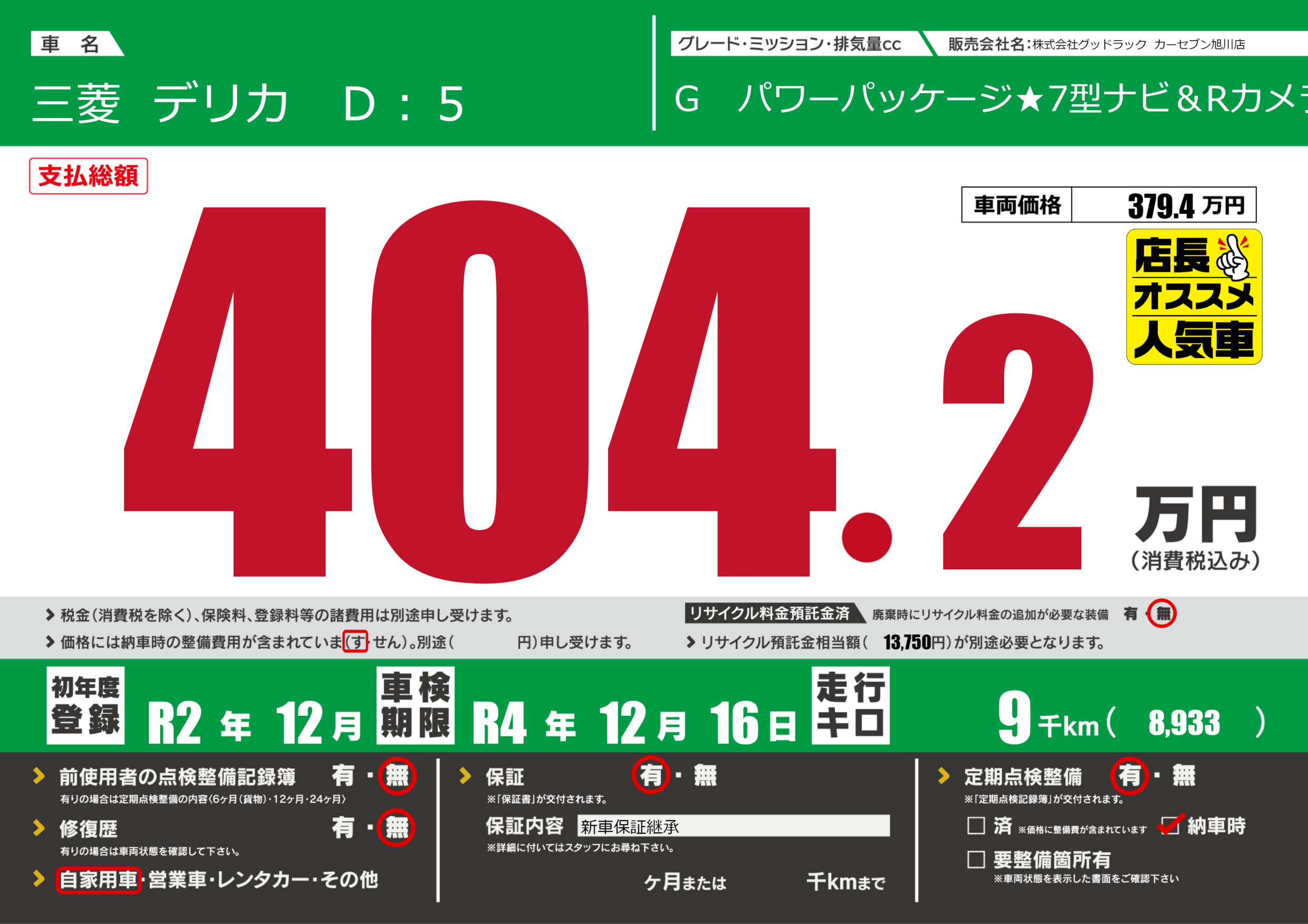 | 車名 | 三菱 デリカ D:5 | グレード ミッション 排気量 |