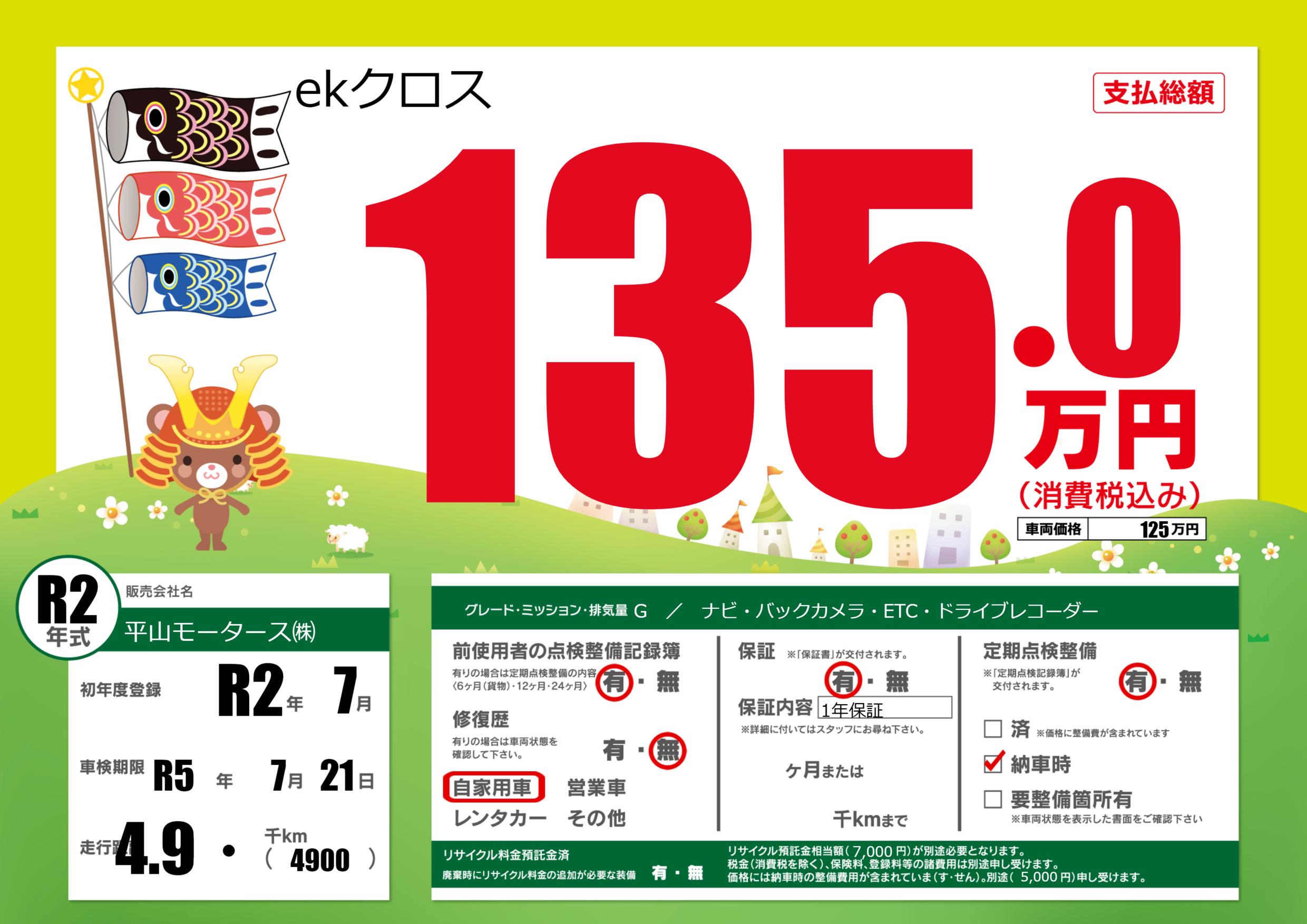 | 定期点検整備 | 定期点検整備あり 納車時あり | ||
