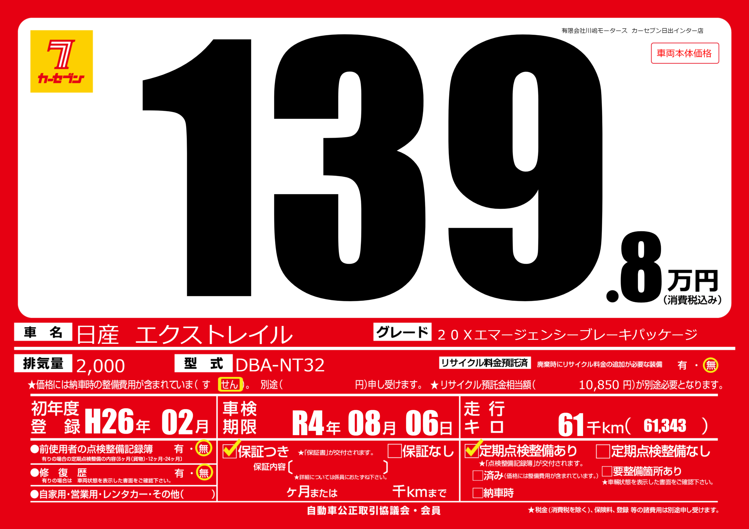 | 車名 | 日産 エクストレイル | グレード ミッション 排気量 |
