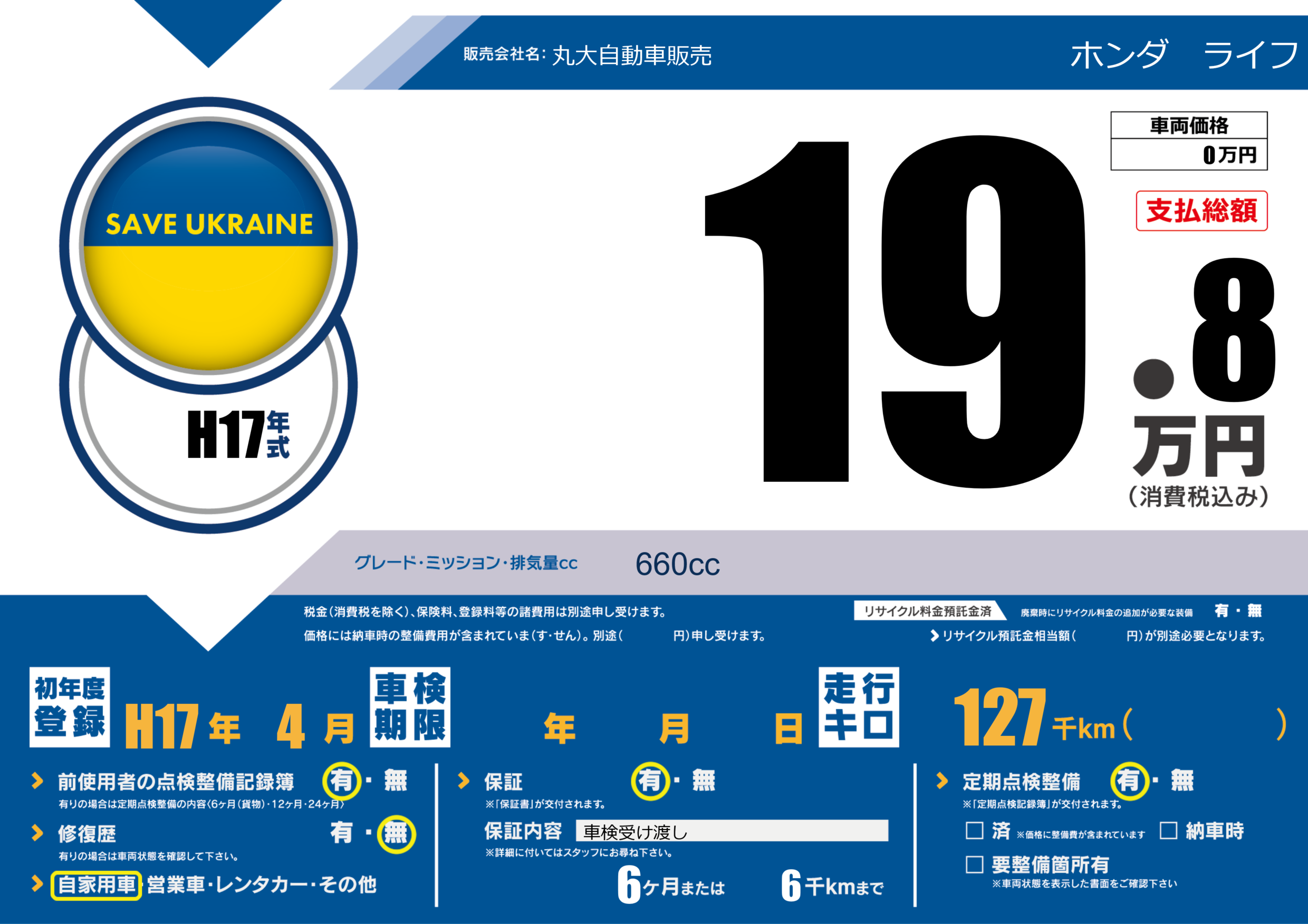 | 走行キロ | 12.7万km | 初年度登録 | H17年4月 |