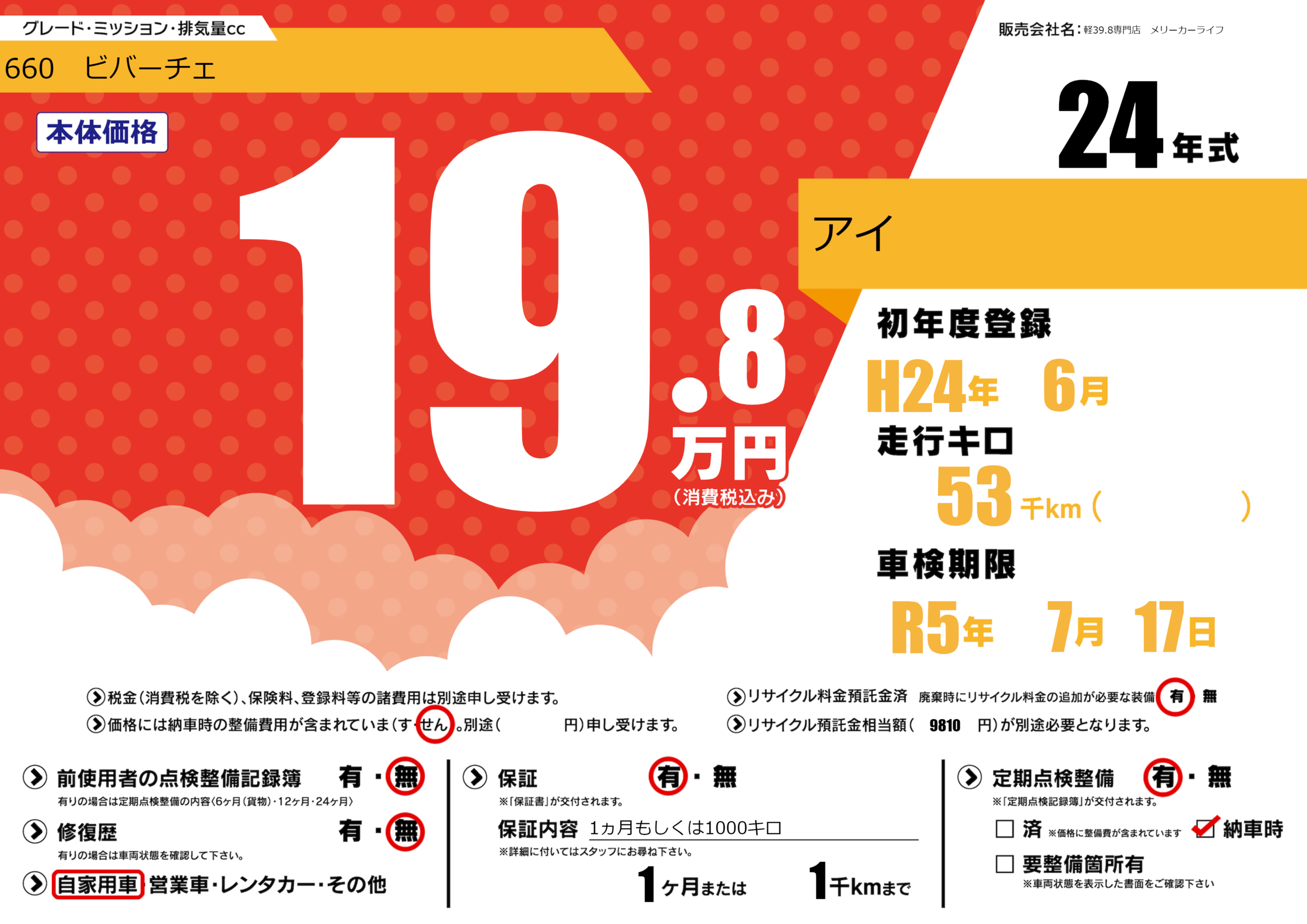 | 定期点検整備 | 定期点検整備あり 納車時あり | ||