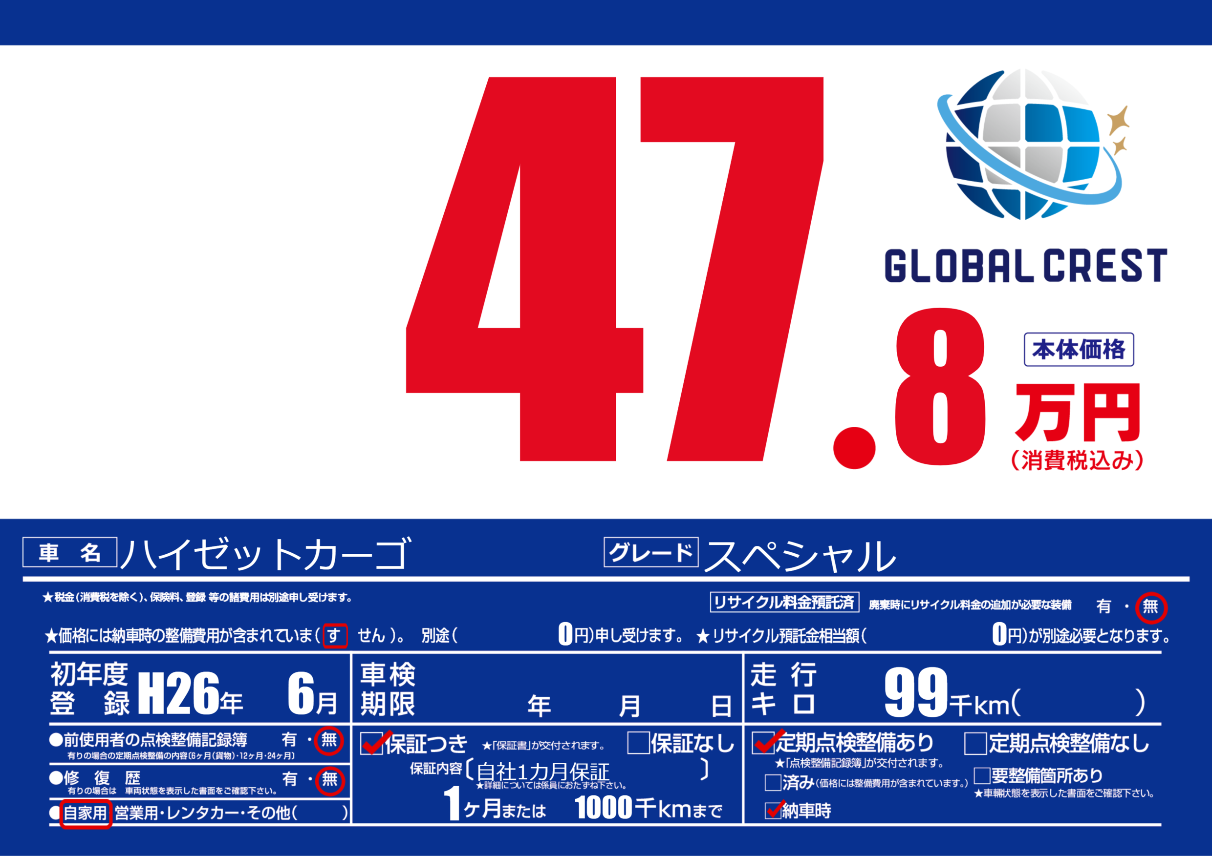 | 車名 | ハイゼットカーゴ | グレード ミッション 排気量 |
