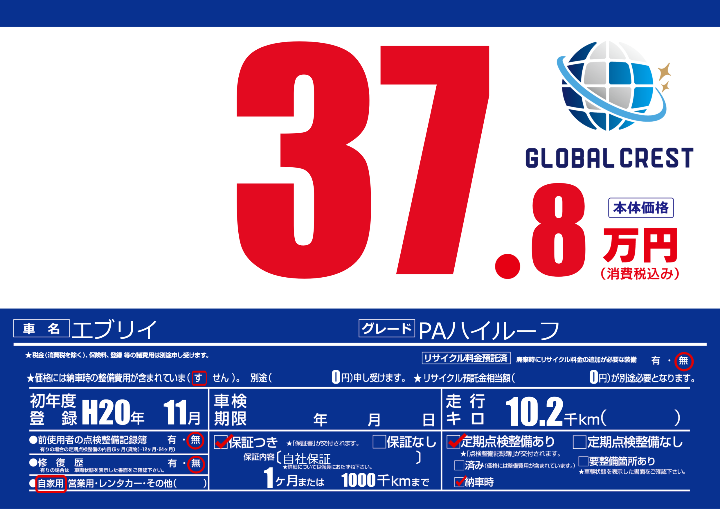 | 車名 | エブリイ | グレード ミッション 排気量 |