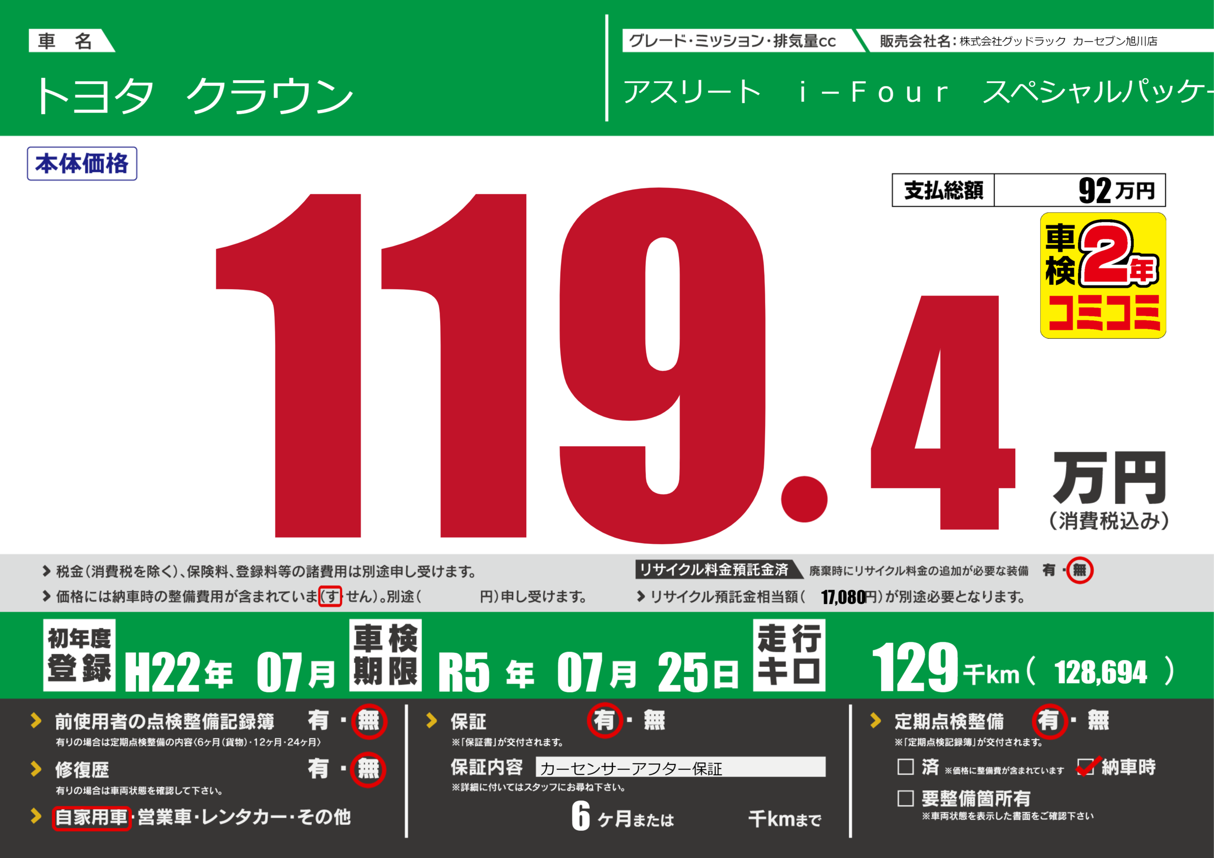 | 走行キロ | 12.9万km | 初年度登録 | H22年07月 |