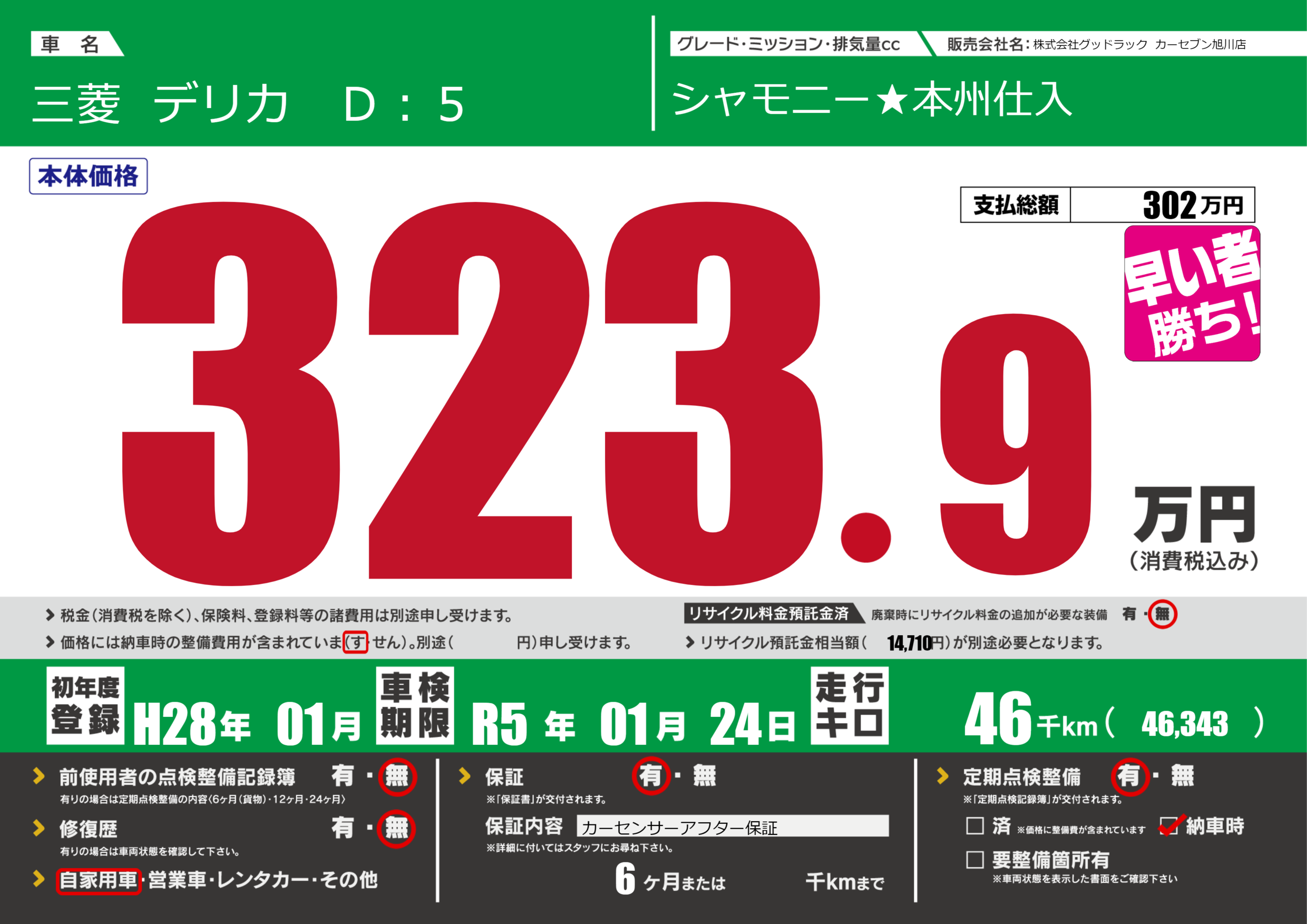 | 車名 | 三菱 デリカ D:5 | グレード ミッション 排気量 |