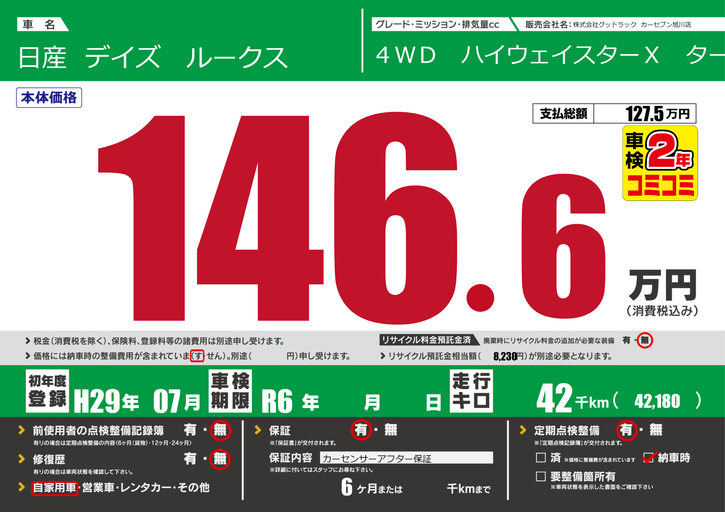| 走行キロ | 4.2万km | 初年度登録 | H29年07月 |