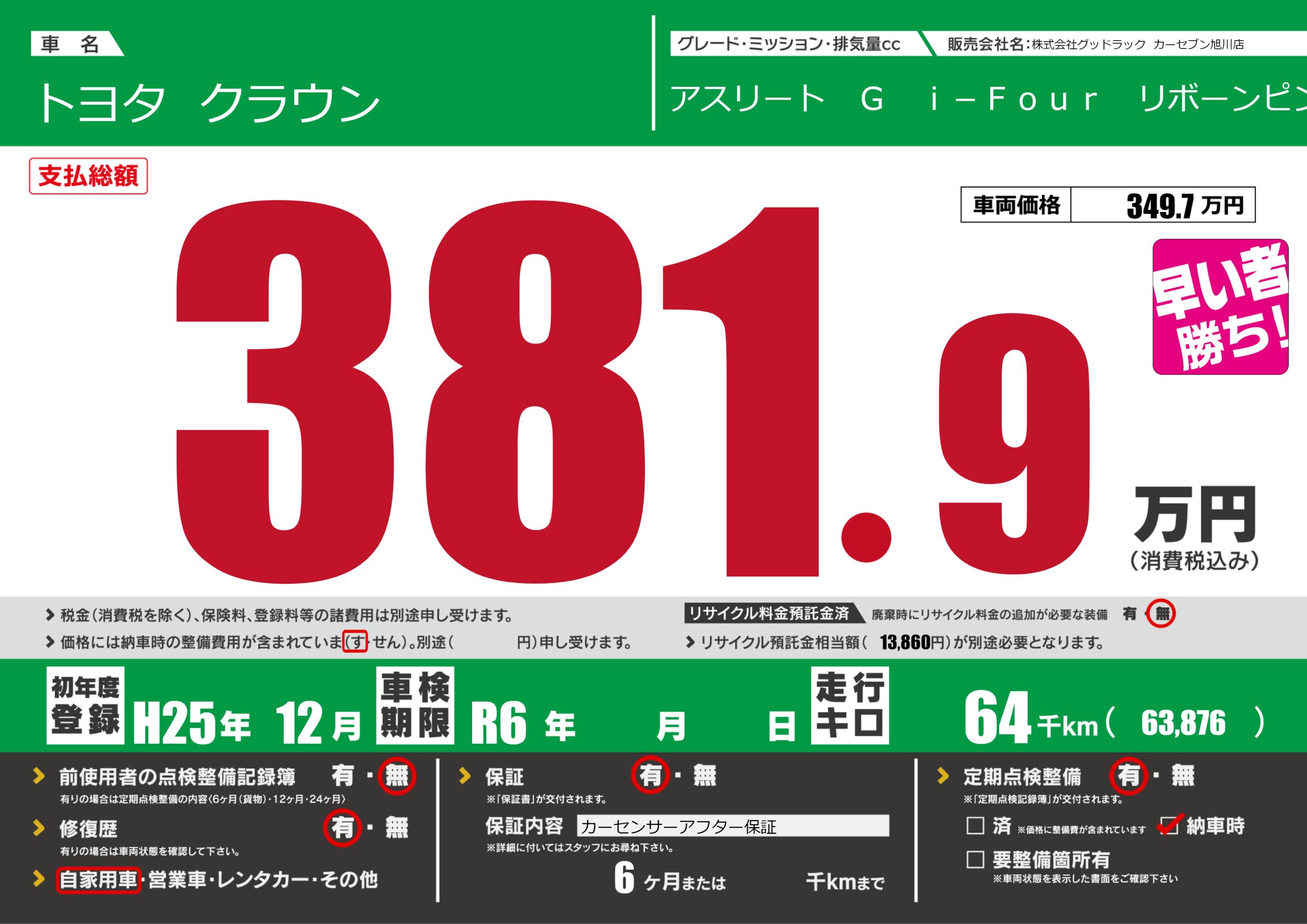| 車名 | トヨタ クラウン | グレード ミッション 排気量 |