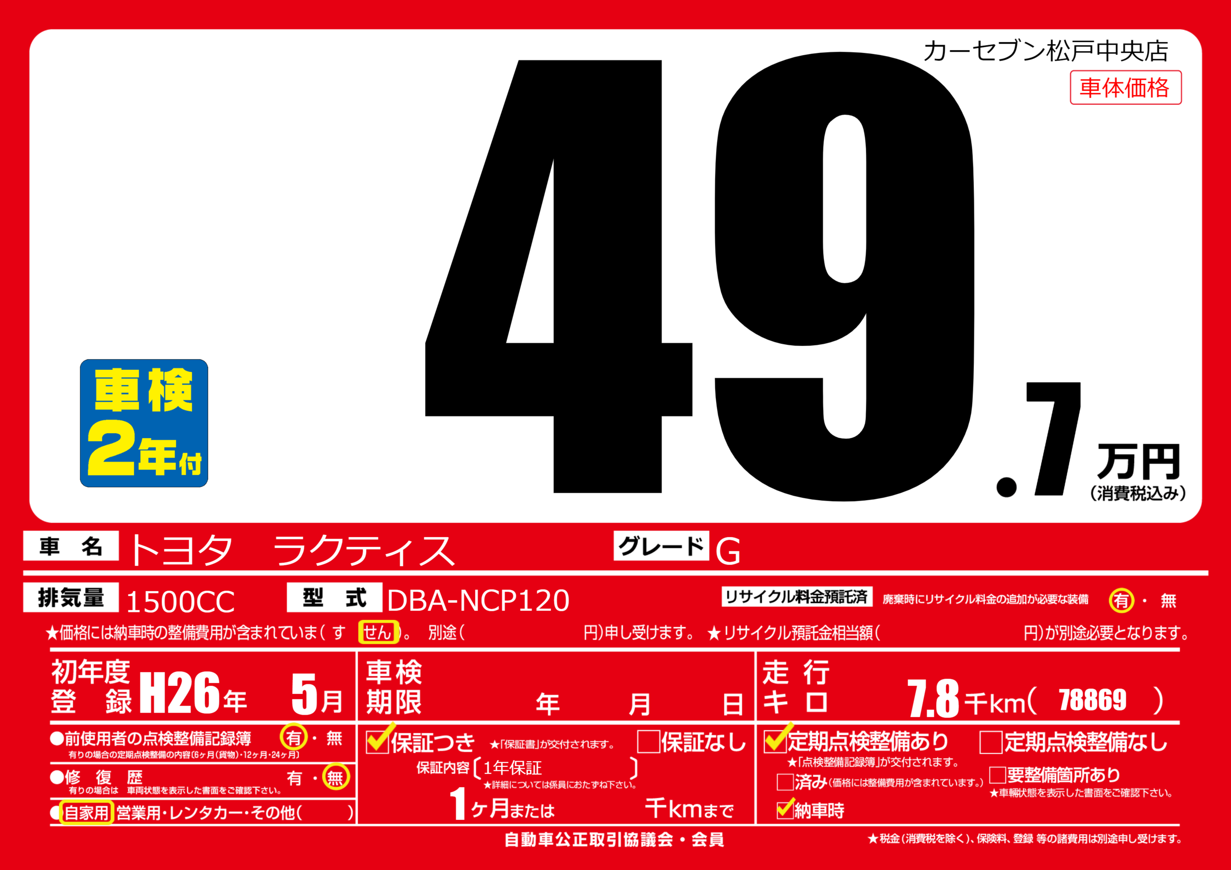 | 車名 | トヨタ ラクティス | グレード ミッション 排気量 |