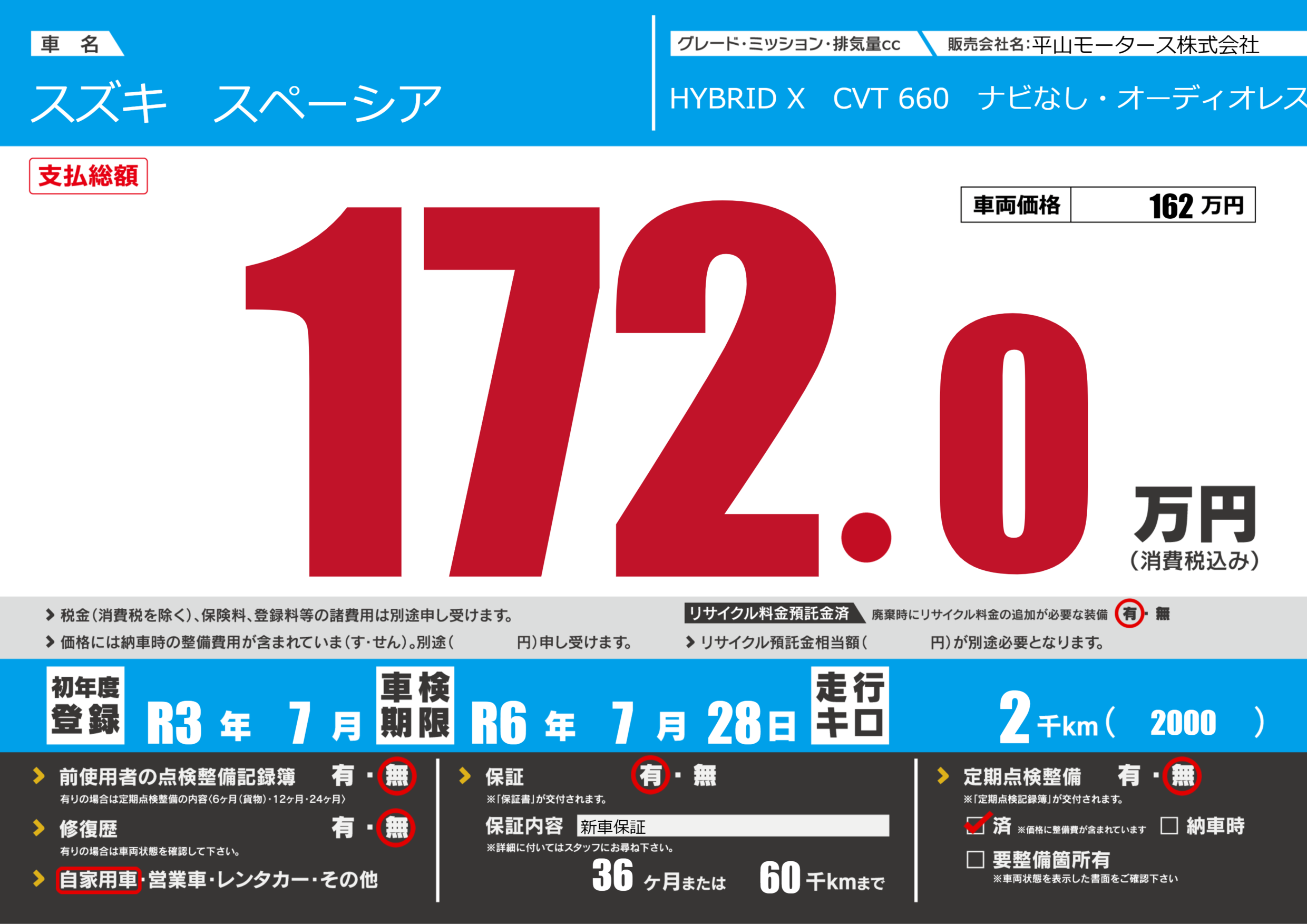 保証付き 保証内容(新車保証) 36ヶ月または(60)千kmまで |
