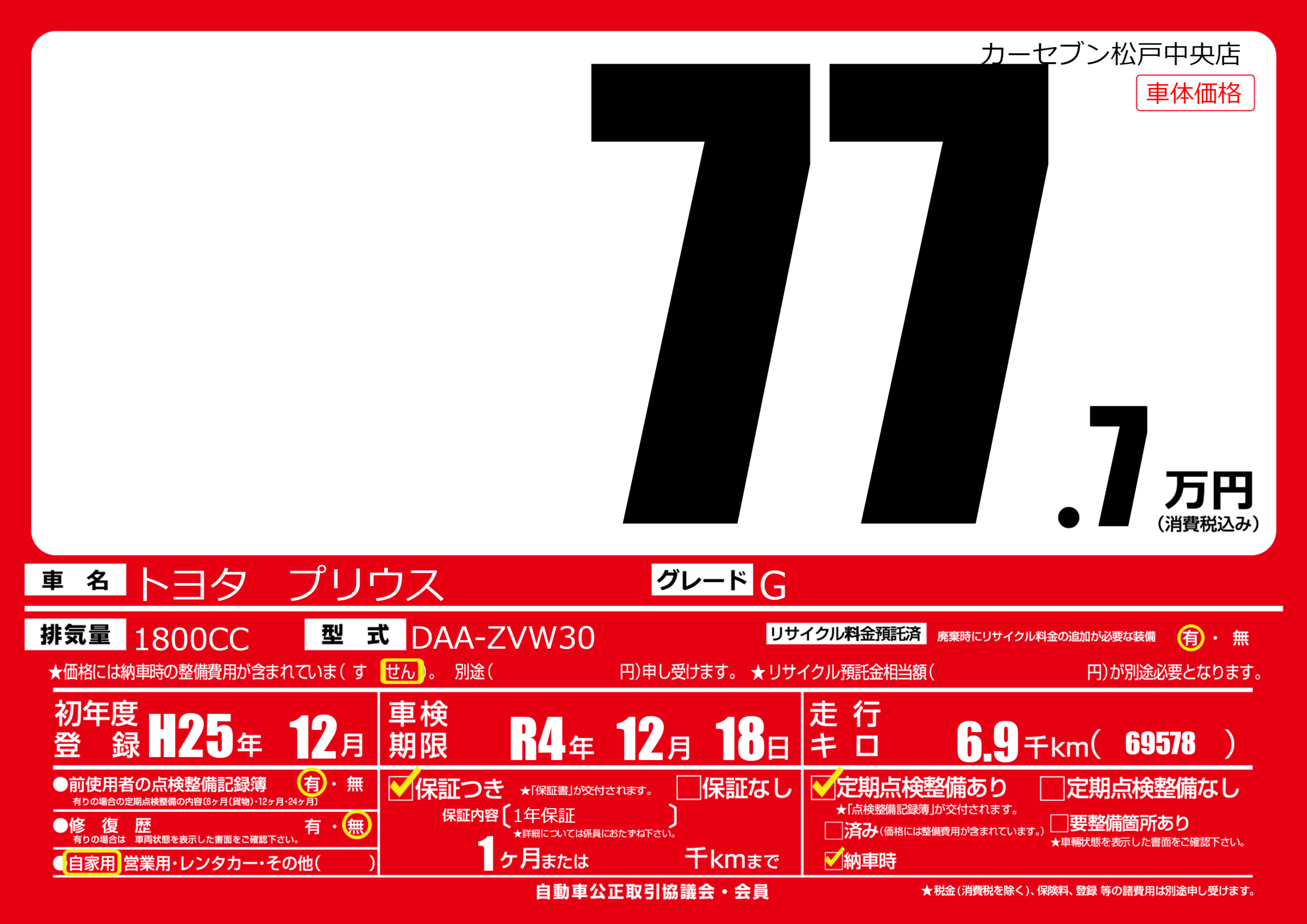 | 車名 | トヨタ プリウス | グレード ミッション 排気量 |